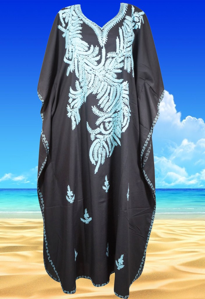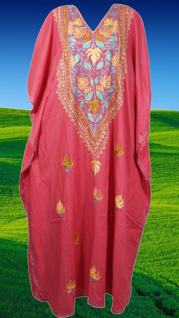 Go wild with sunset colors or peaceful blues, lush cotton cafttan with hand embroidery from India can be worn as dresses, cover ups or loungers. Intricate hand embroidery makes each piece unique and perfect for only you.