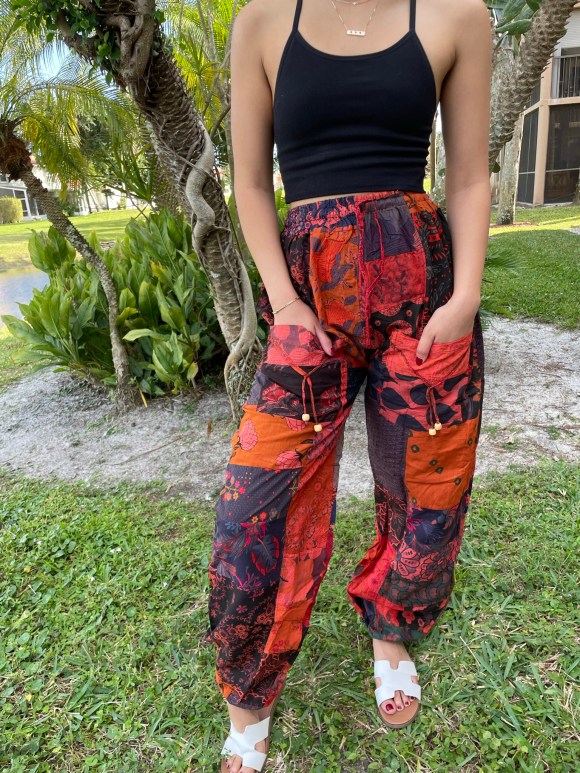The free-spirited bohemian harem pants are loose-fitting and cuffed at the ankles making them great yoga pants or beach pants. The simply styled boho pants and the love for natural fabrics makes it easy to fall in love with the patchwork pants. Handmade Hippie Pant with original creativity, colors and patterns the ruched waist hippie pants made from recycled saris are an expression of bohemian love.Â