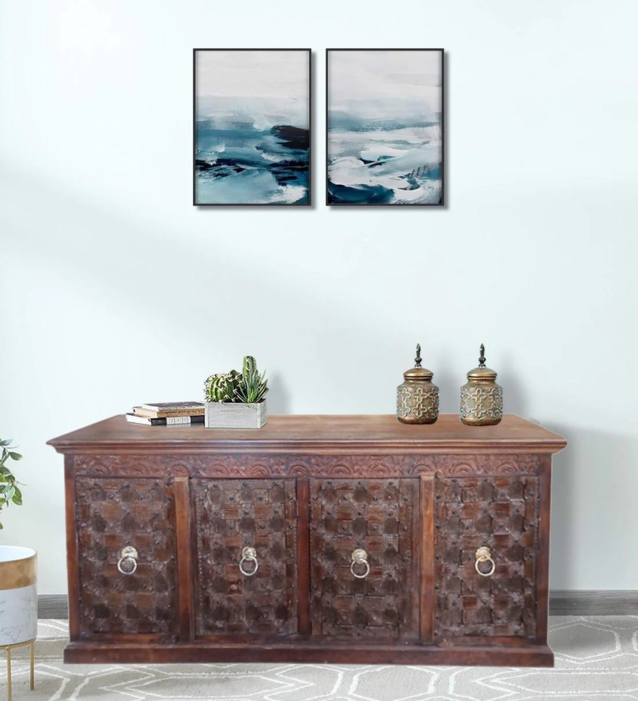 Decorating with furniture made by hand from reclaimed woods and functional art that has a history, a meaning, a reason that defines its presence, is seen in the antique armoires with old doors carved with sun rays and floral designs. An 18th-century Indian console, and a cocktail table made from old windows with a lovely distressed carpet completes the picture.