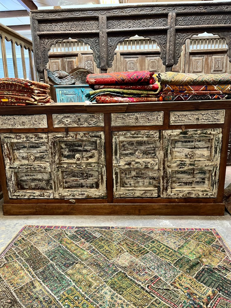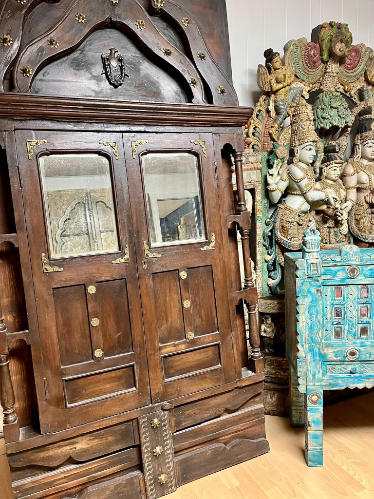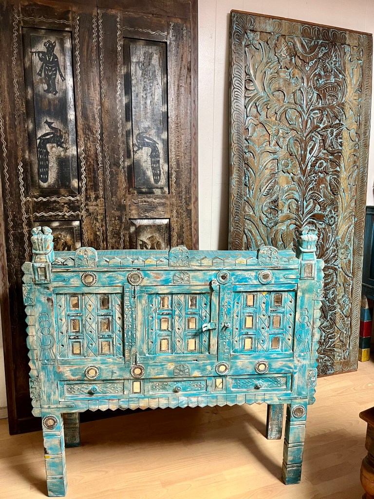 At the heart of the kitchen stands a vintage armoire, its weathered wood and intricate carvings bearing witness to decades of history. Adorned with brass hardware and ornate detailing, it serves as both a functional storage credenza and a statement piece, adding depth and character to the space.