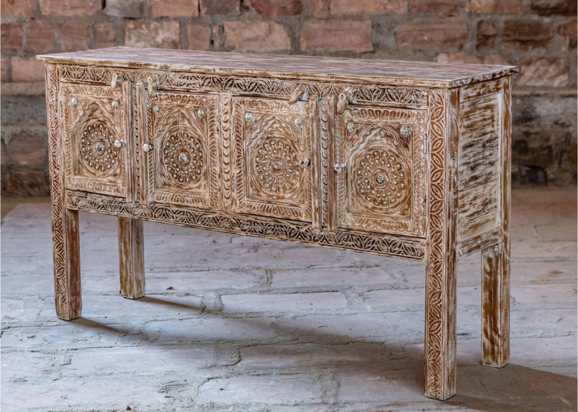 Incorporating vintage carved doors, rustic distressed armoires, brass-studded consoles, and whitewashed credenzas into your coastal boho farmhouse decor can add character, warmth, and texture to your space. Here’s how to integrate these elements effectively: