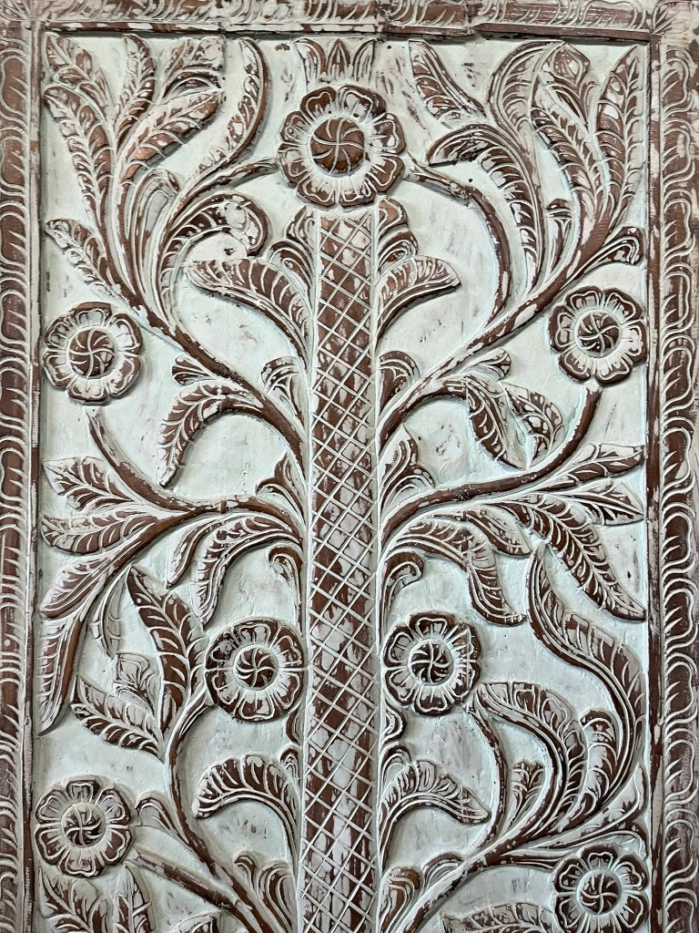 Elevate your living space to resort-style luxury with the Kalpavriksha Accent Wall Art, hand-carved to perfection. This Tree of Life Sliding Barn Door boasts an ornate, distressed white carving and vintage wood finish, exuding classic old-world charm. Its intricate design adds a unique rustic touch to any environment, creating an ambiance of warmth and sophistication. Whether placed in a living room, bedroom, or study, this interior door promises to be a captivating conversation piece, inviting admiration and awe from all who behold it. Embrace the timeless beauty of artisanal craftsmanship and bring a touch of serenity and harmony into your home with this exquisite hand-carved masterpiece.