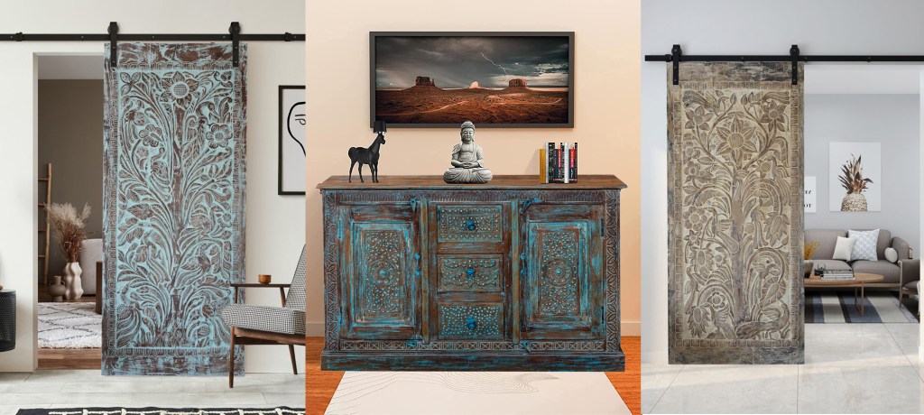 Choose a stunning piece of vintage wall art featuring intricate carvings of natural motifs like the Tree of Life door or Lotus flowers. These symbolic designs represent growth, renewal, and the interconnectedness of all living things. shop carved door at etsy Mogulgallery