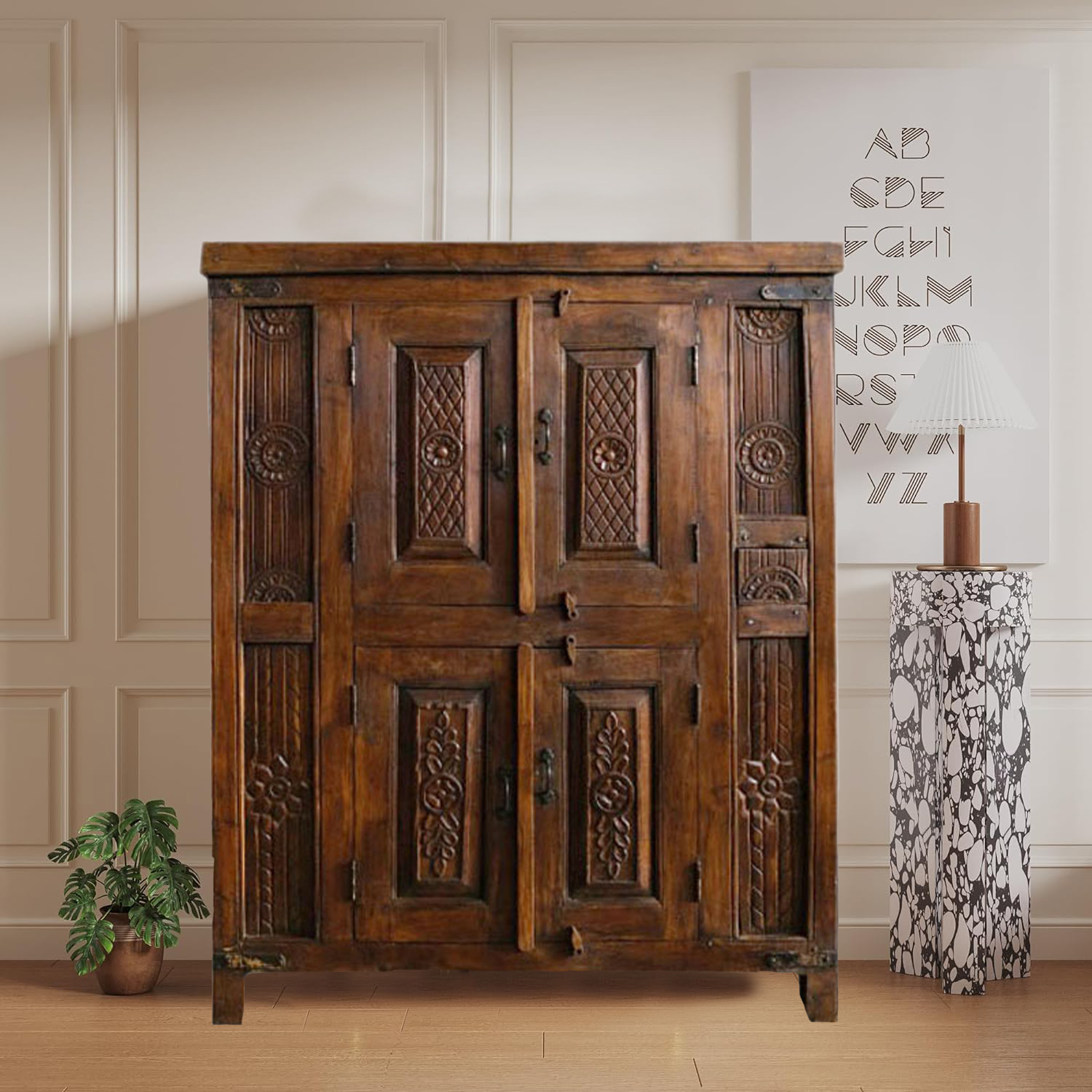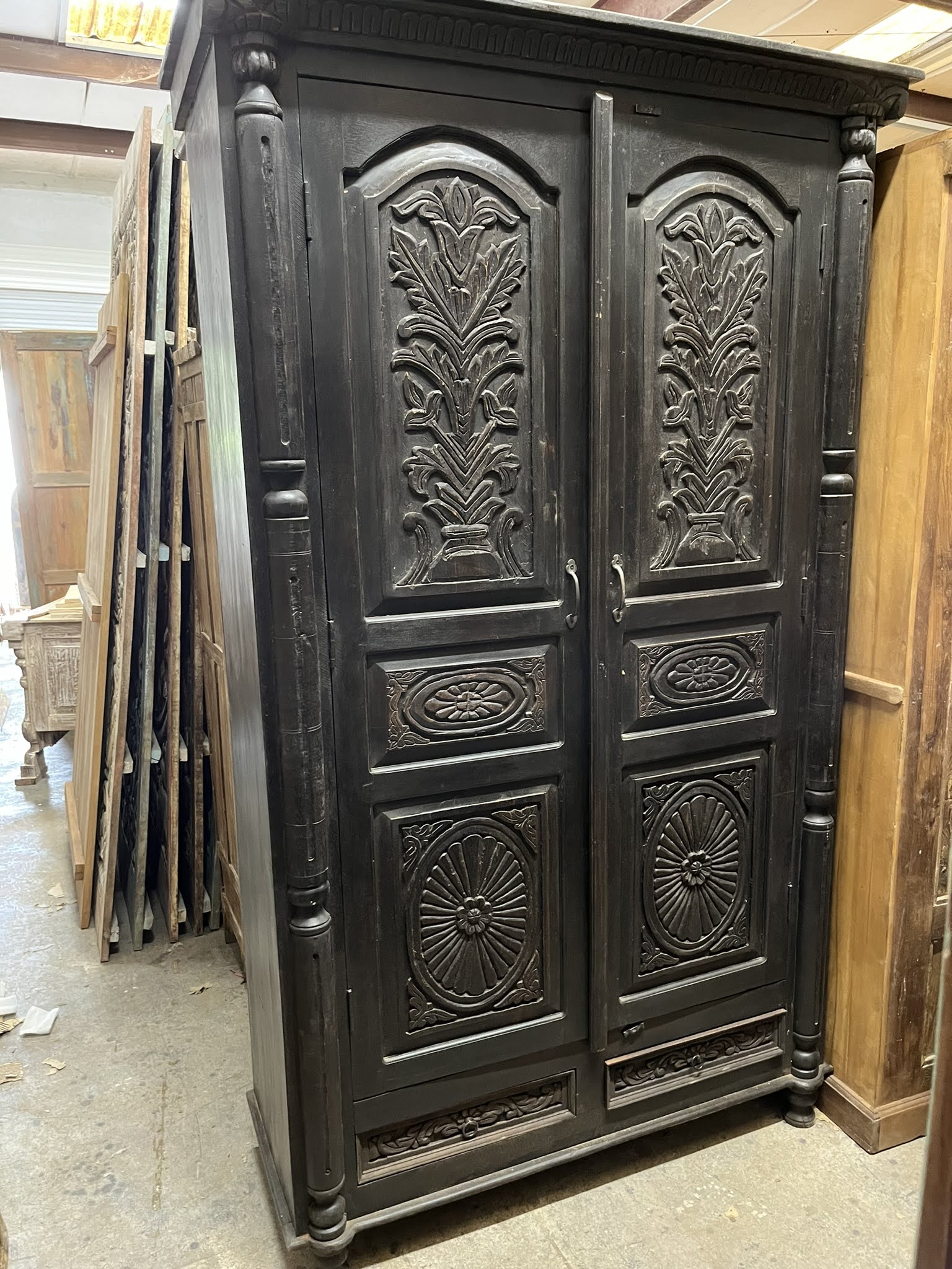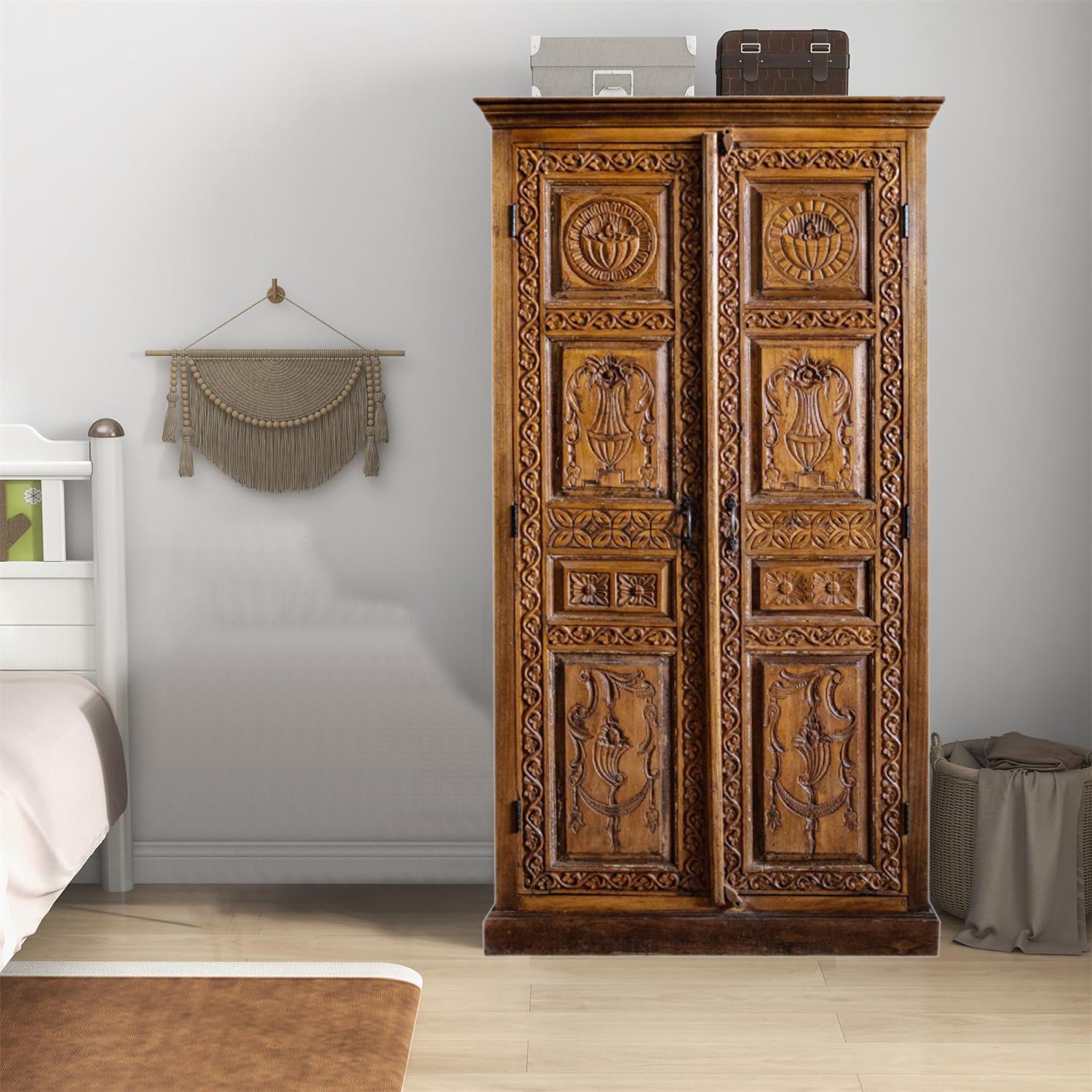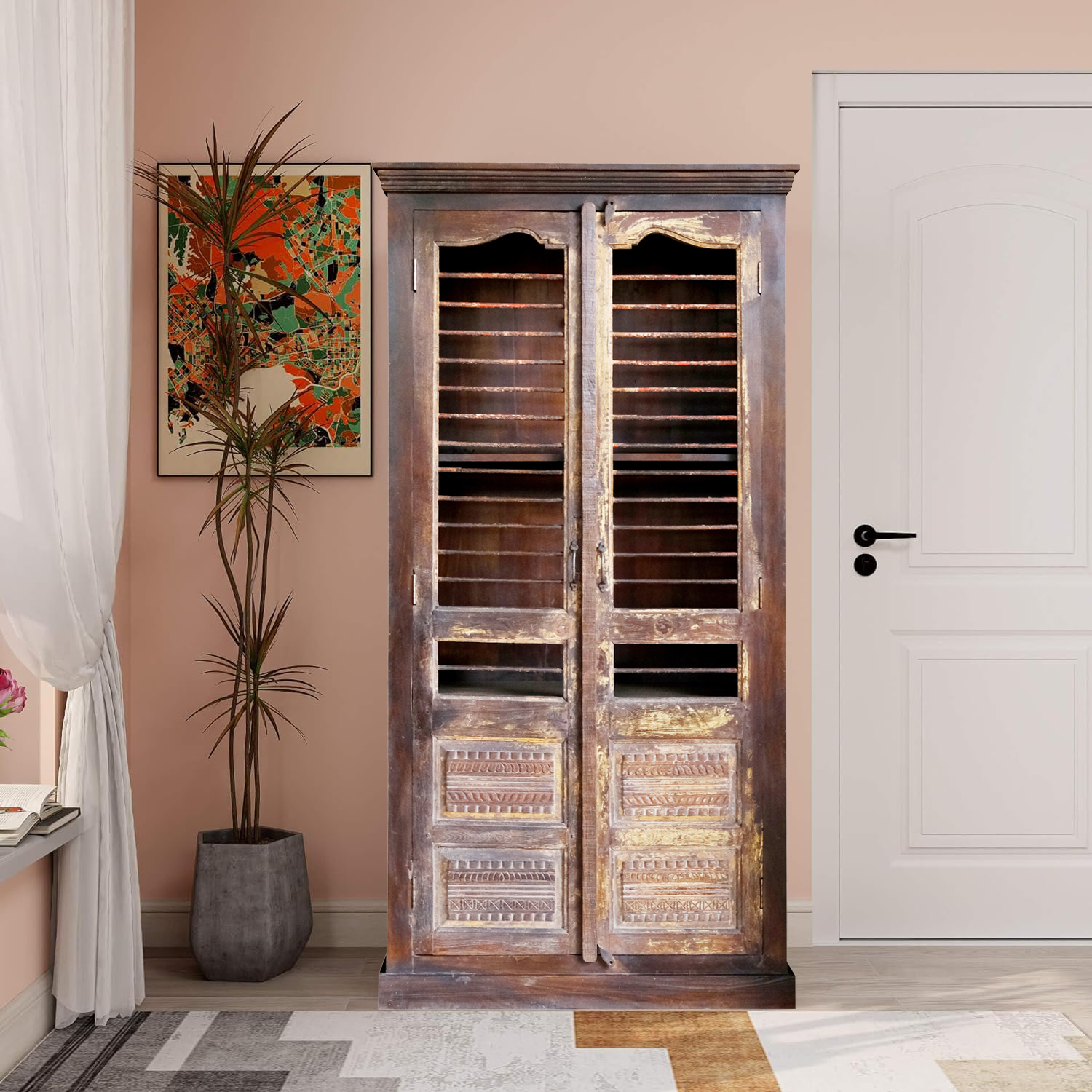 Combine the new into the old. The bathroom glass shower disappears into the stone wall. The carved Tree of Life barn door adds softness to this rustic room. Exposed beams and a carved natural stone Buddha statue carries the zen ambiance through with a waterfall cascading behind it and lots of broad leaf palms accent the white stone walls. Exposed plumbing and electrical conduits run parallel to the cabinets. Primitive lanterns and old ceiling fans with a utilitarian feel hang from the exposed rafters. Rustic handmade wardrobe cabinets give extra storage as well giving and old world sophistication to the room.
