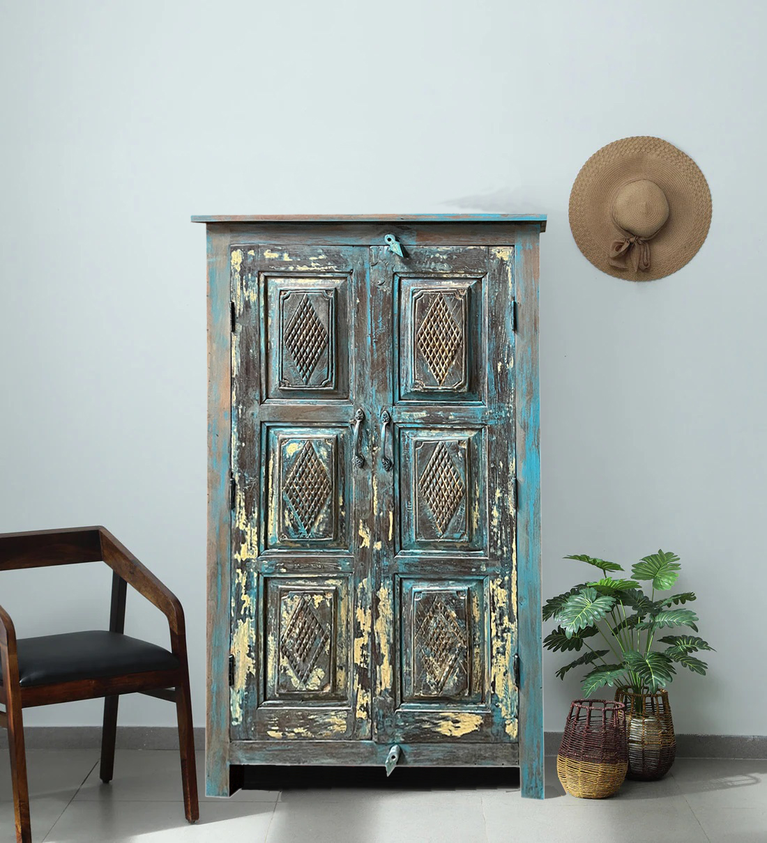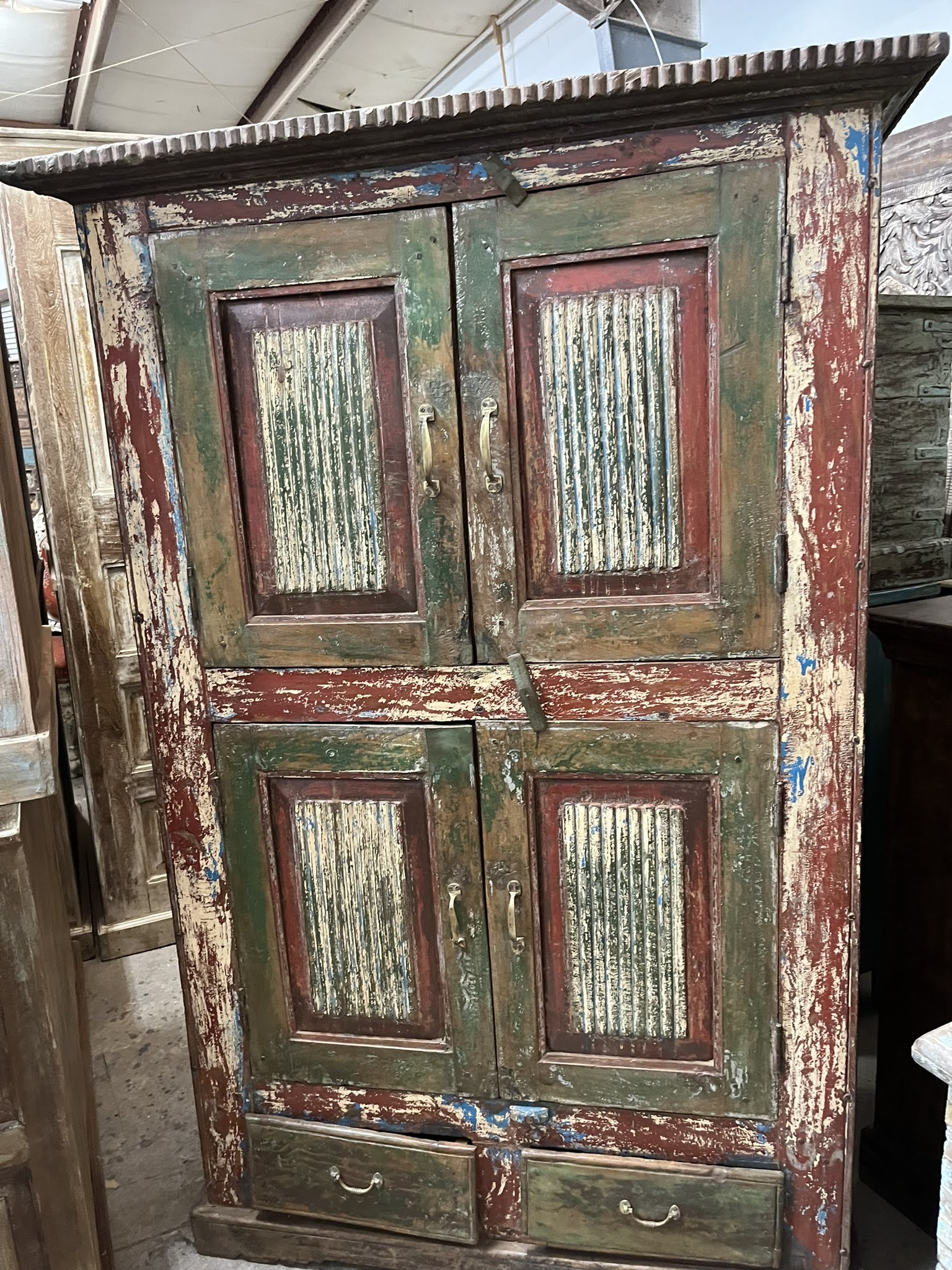 Find an old steel sink for the bathroom and convert a rustic chest into a vanity. Reclaimed old doors are used to make these chest and are very earth friendly. Some have metals like iron and brass that will balance the energy in the room by grounding the negative ions into the earth. An old window frame with iron accents was used to make a mirror. Run a simple sari curtain instead of cabinet doors to cover up storage without taking away from the rough textures of the old woods.