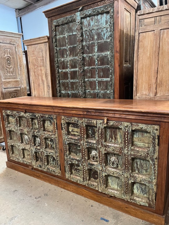 Transitioning into the dining room, located at the heart of the “triple parlor,” one is immediately struck by the eclectic mix of styles. A traditional-style wood dining table, repurposed from an antique Indian door, takes center stage, surrounded by a vibrant ensemble of modern office chairs covered in bold blue wool and woven seagrass host chairs. A rustic modern credenza, fashioned from reclaimed doors in turquoise, serves as a striking buffet, infusing the space with bold colors and vintage textures.