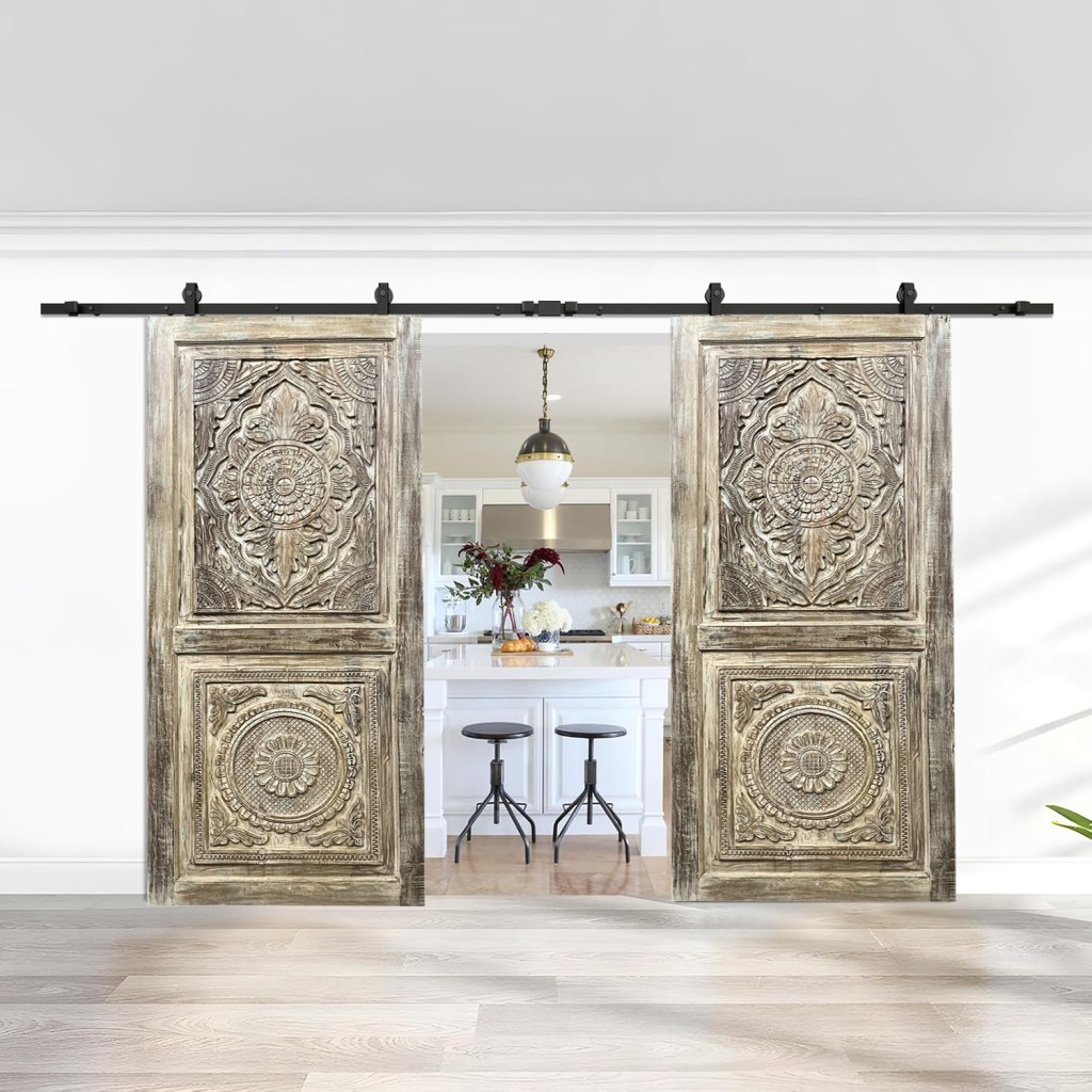 Consigned Pair Barn Door, Floral Carved, Sliding Door, Hand Carved Doorby Mogul Interior