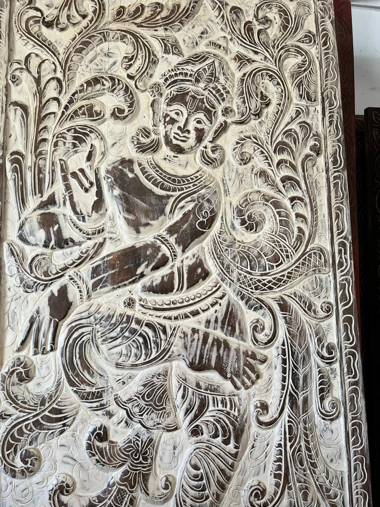 Resort-style themed décor featuring carved barn doors creates a luxurious yet grounded ambiance, perfect for enhancing any home interior. Showcasing the Antiqued Fluting Krishna with Cow, a vintage Indian wall sculpture, these hand-carved Krishna pieces make a stunning addition to rooms, yoga studios, or vintage-inspired interiors. Whether used as sliding barn doors, statement pieces, or studio doors, they epitomize a new wave of boho chic, channeling a free-spirited yet elegant vibe with an earth-conscious aesthetic. Find Us At Mogul Interior