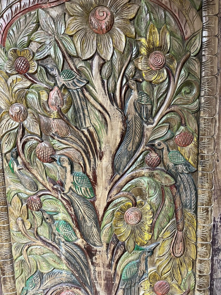 Introduce the Tree of Life motif to bring depth and meaning into the room. This ancient symbol, representing growth, unity, and connection, beautifully contrasts with the vintage elements while harmonizing with nature-inspired decor. A large statement piece featuring the Tree of Life serves as both a visual centerpiece and a conversation starter. To achieve balance, consider the scale and texture, ensuring harmony between the artwork and other design elements. Place the art prominently on an adjacent or opposite wall from the carved armoire, ideally centered above the sofa or main seating area, allowing it to stand out without dominating the space.