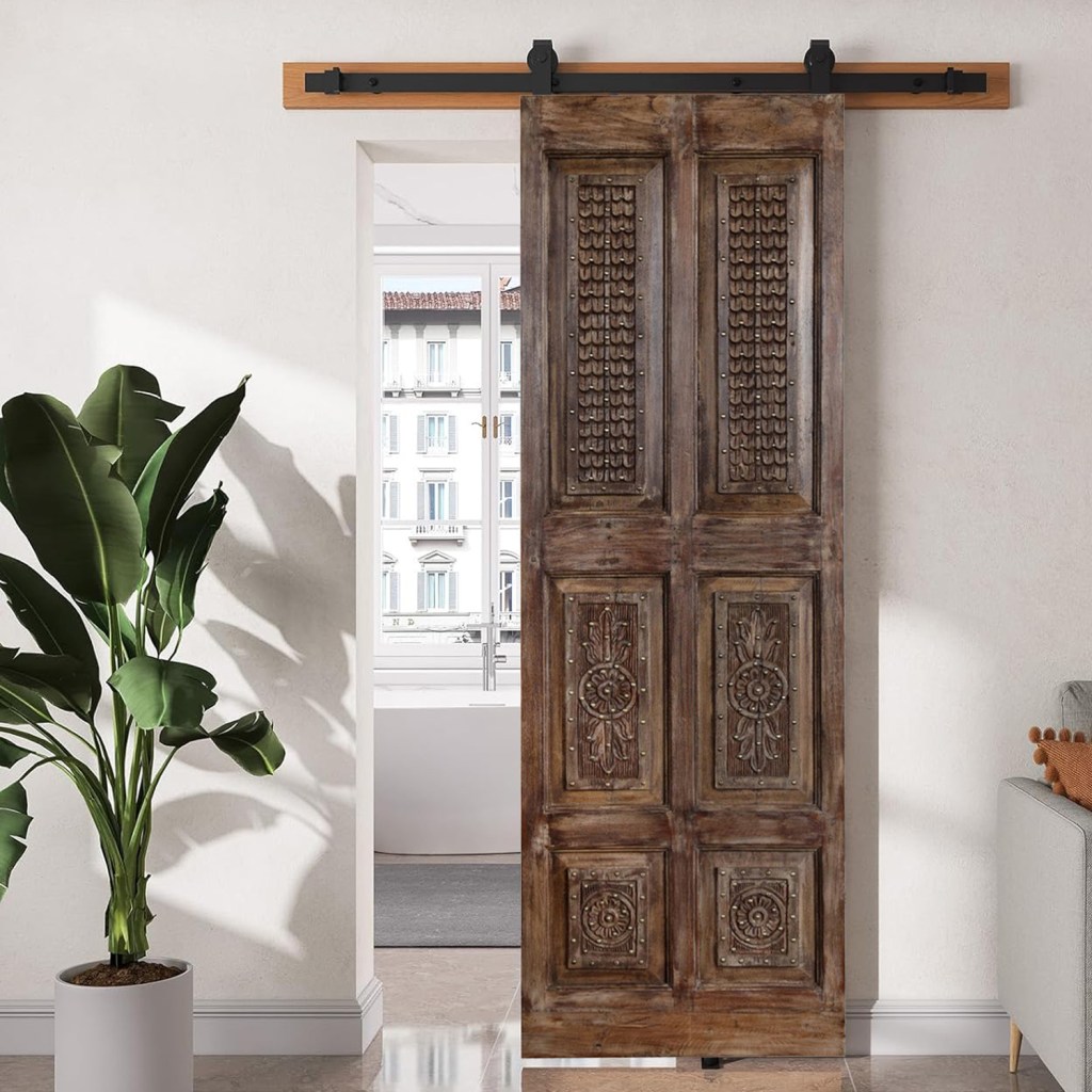 Complement this setup with vintage floral carved door panels behind the dining area or as a sliding pantry door, creating a farmhouse focal point. These doors—especially in warm wood tones or distressed finishes—bring a historic charm that feels welcoming and festive. Inviting Front Porch: Frame the entryway with Mexican-style or French floral carved single sliding barn doors to set a charming tone right from the start. Add farmhouse touches with pumpkins, cozy lanterns, and potted mums to make the porch feel inviting and seasonal. A weathered bench with plaid blankets adds extra warmth and texture.