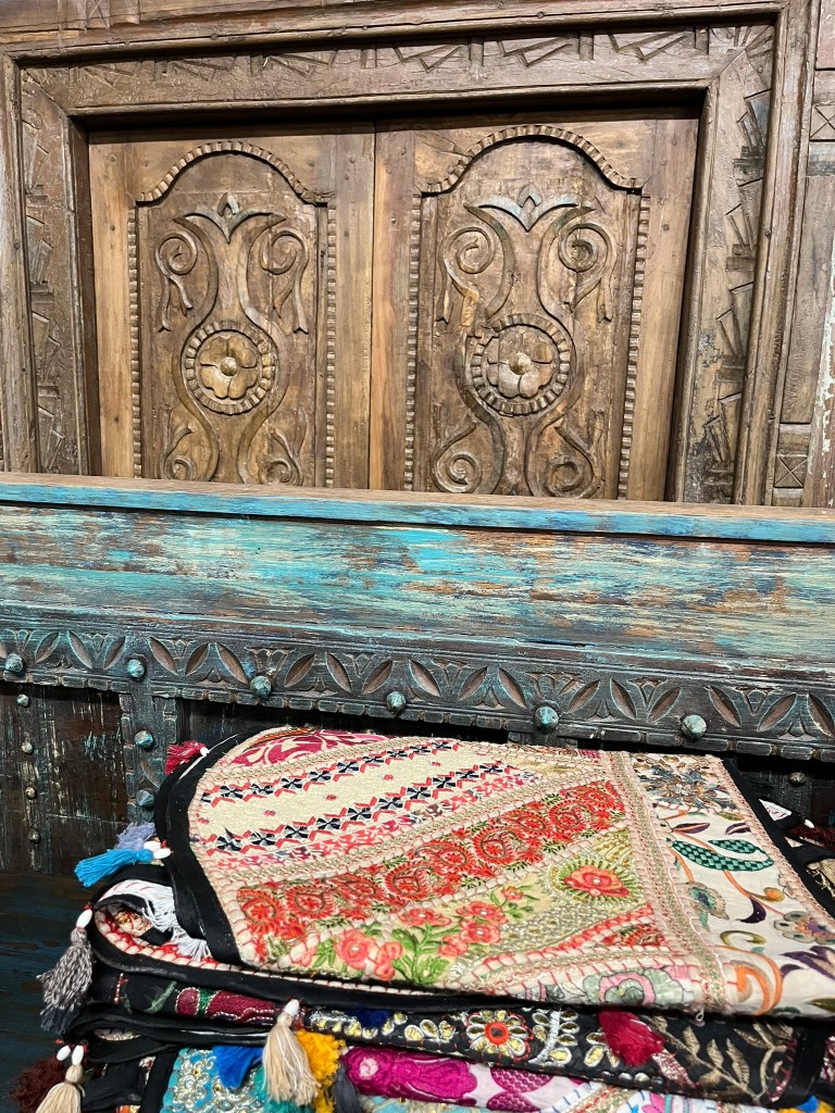 Vintage hope trunks along with teak British cabinets on peg feet and patchwork tapestries strung together in a rhapsody of vagabond colors.