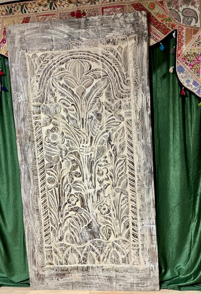 Bring the outdoors in with lush greenery and potted plants. Consider hanging tree of life wall carvings to add vibrancy and life to the room. The juxtaposition of organic elements against the aged patina of the doors can create a visually striking contrast.