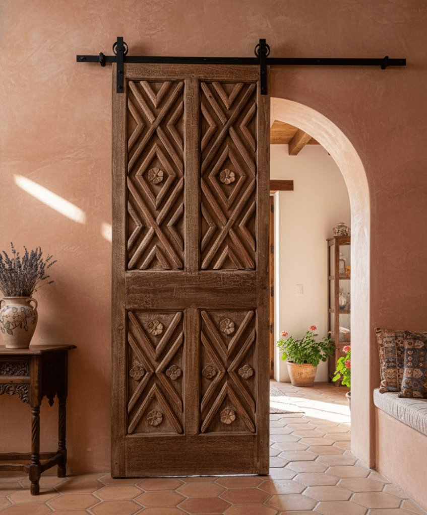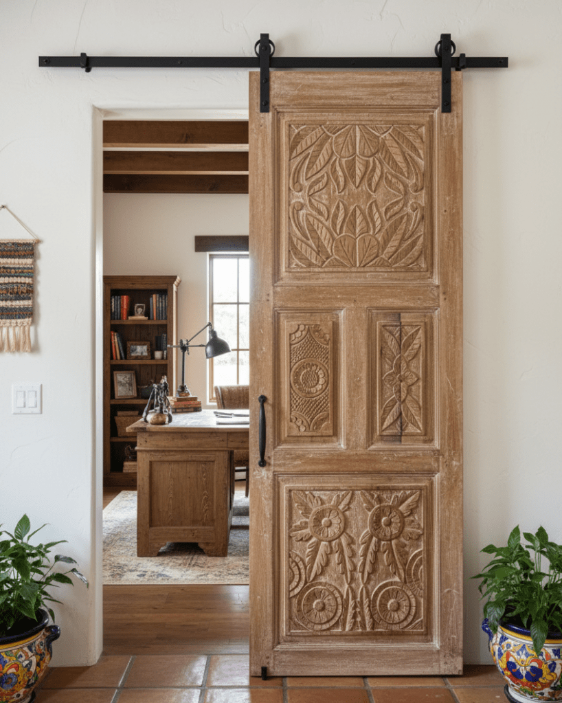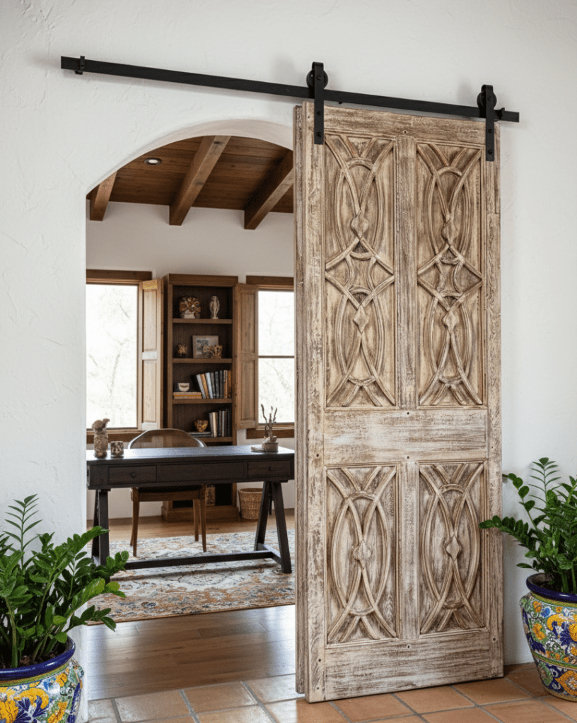 Barn doors are also perfect for maintaining an open floor plan while offering the option to close off rooms as needed. Mounted on tracks above the doorway, they can fit over most openings, providing a versatile solution for various spaces in your home.