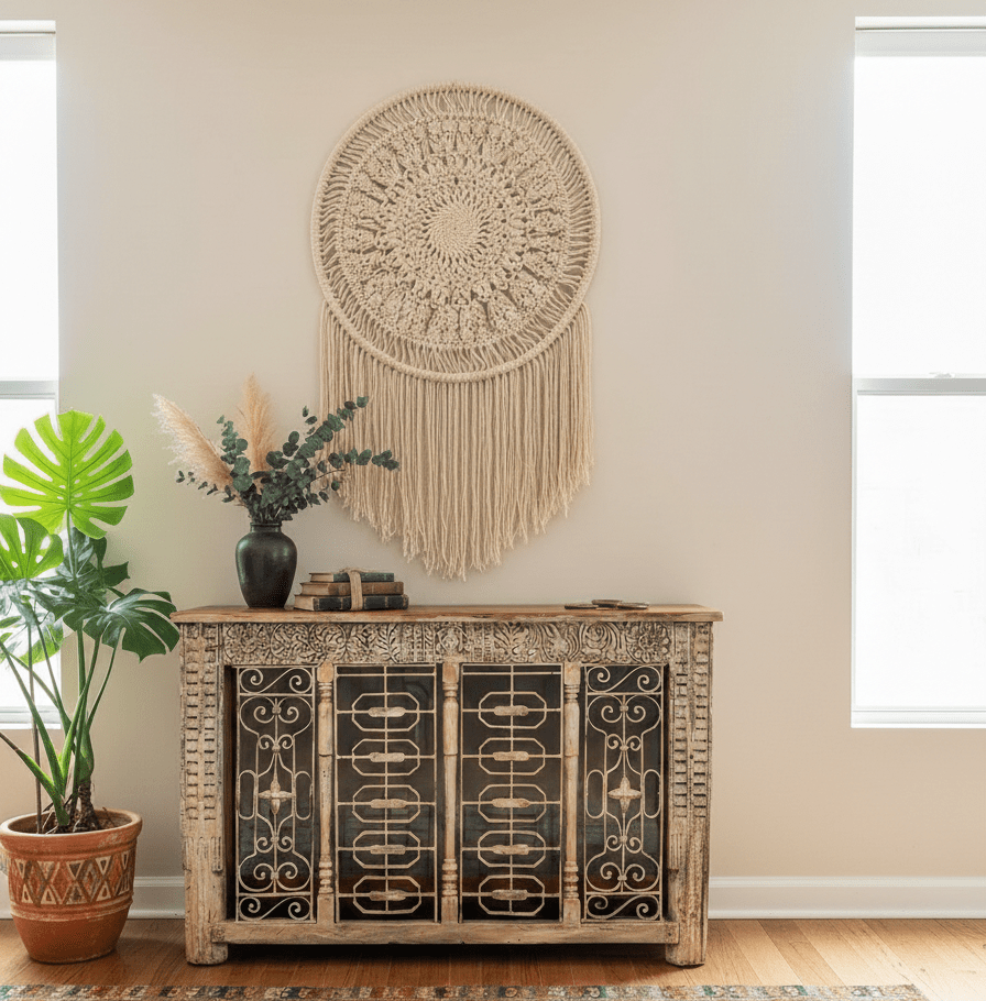Embrace the enchanting fusion of boho chic decor and authentic Indian furniture, seamlessly integrated into modern home aesthetics. Step into a realm of vibrant hues, intricate tribal motifs, and luxurious textures that radiate warmth and charisma. Elevate your living space with an array of eclectic vintage armoires, brass-studded credenzas, and nature-carved barn doors that infuse every corner with vitality and character. Find Us At Etsy DoorsByMJ