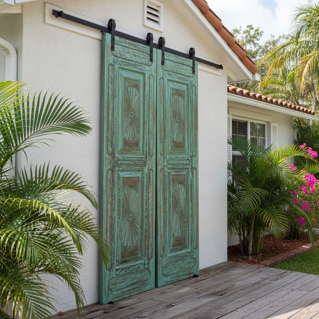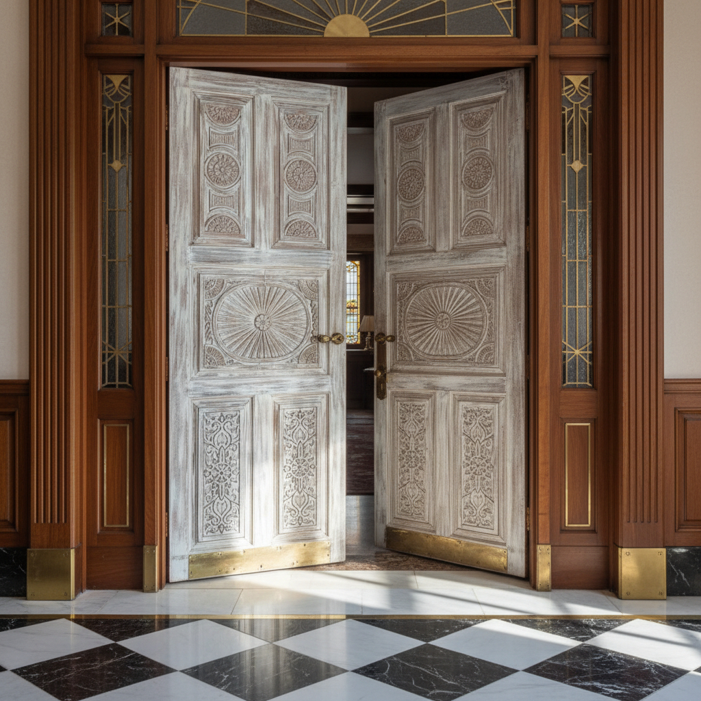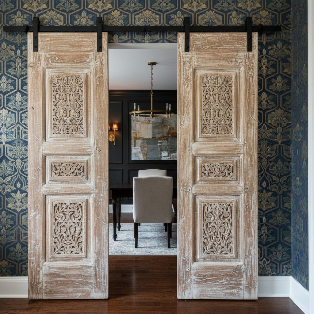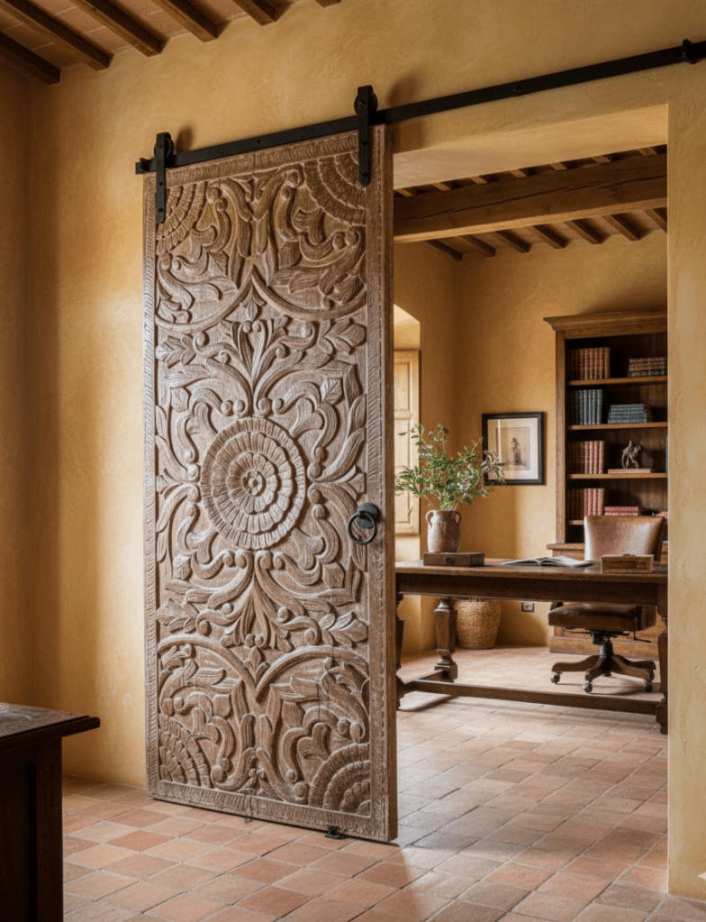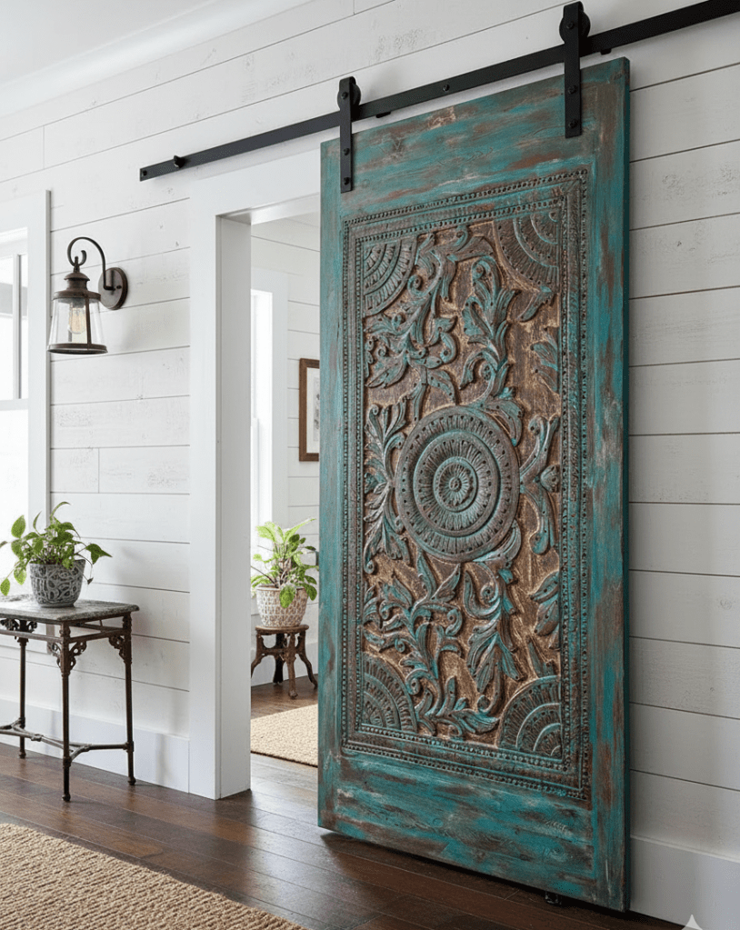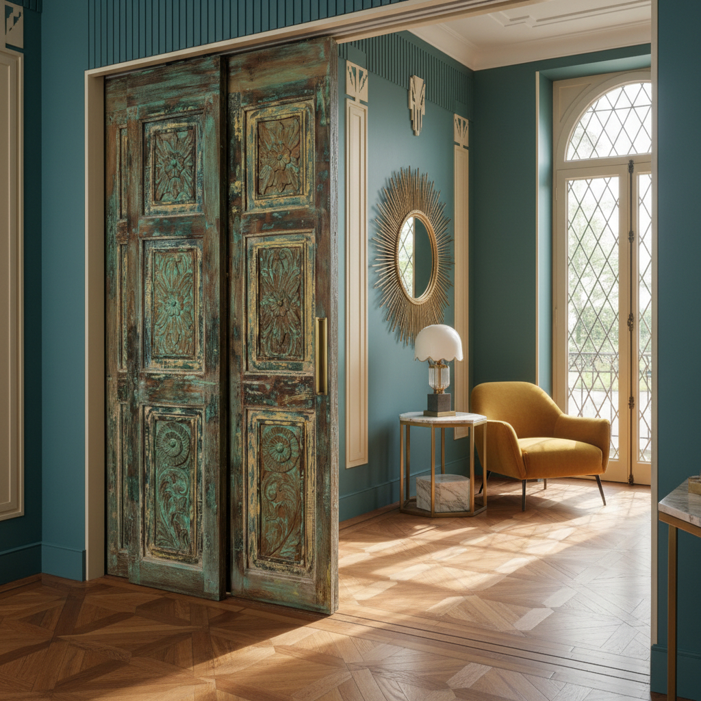 How to Incorporate This:Â Introduce vintage, ornately detailed furniture that complements your carved door. Mix in pieces with natural textures like cane chairs, wood, or brass accents to create a tactile contrast.