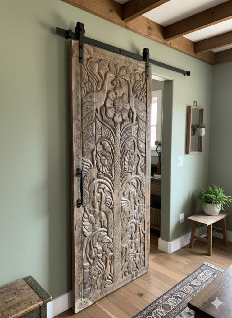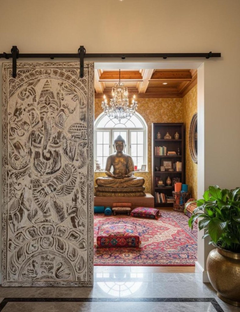 In the main living room, the Antique Indian Doors are repurposed as a dramatic feature wall panel — layered, carved, and alive with geometry that rewards a slow gaze. Beside them, the vintage Dancing Ganesha Carved Wood Door – Jeweled Indian Feature Wall Temple Decor commands its own sacred corner. Ganesha, remover of obstacles, feels right at home in a Texas casa with big dreams. The jeweled inlay shimmers against warm ambient lighting, turning an ordinary evening into something ceremonial.