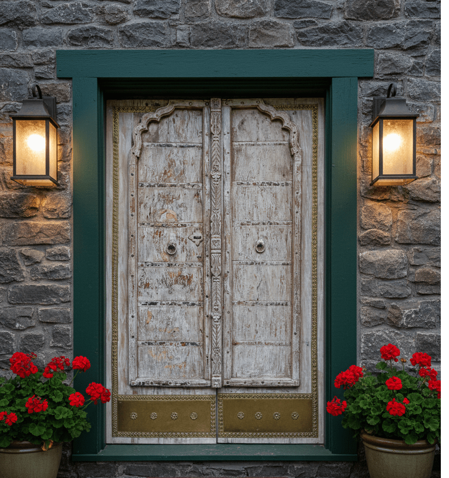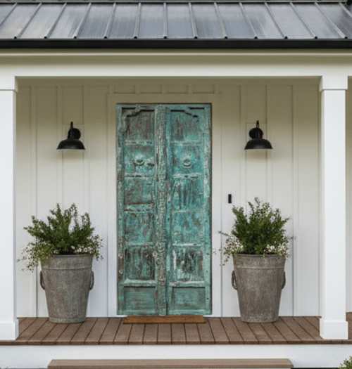 First impressions begin at the threshold. Casita Chica greets visitors with the Blue Patina Rustic Teak Double Doors, their weathered turquoise finish whispering of Mediterranean bazaars and coastal Indian trading ports. Flanking them or tucked into a side passage, the Vintage White Floral Carved Wood Door brings a softness — intricate blooms frozen in pale timber — that feels equally at home against Texas limestone as it does evoking an old French colonial estate.