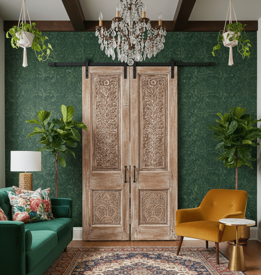 Incorporating vintage doors into modern interiors creates a dynamic juxtaposition. A minimalist wall becomes a canvas for maximalist art. A neutral room gains texture and depth. Whether used as a sliding pantry door, a headboard, or a reclaimed wall panel, each door anchors the space with personality.