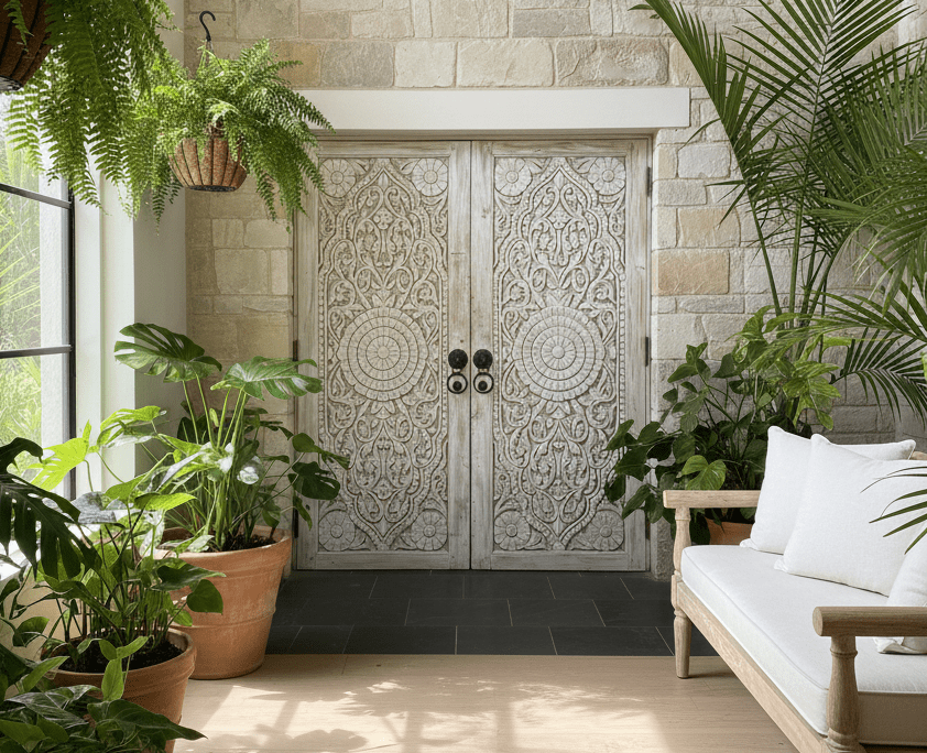 Leaning behind a desk or mounted like a relic on the wall, a carved door shifts the mood instantly. The room feels older, deeper, as if it has been rearranged many times before you arrived. The grooves and patterns catch the light in uneven ways, creating shadows that change throughout the day. In a workspace, that movement matters. It keeps the room from feeling static, from feeling like it belongs only to deadlines and screens.