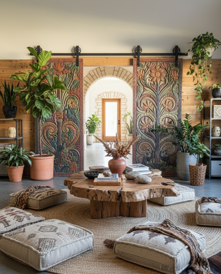 Every memorable room has a moment — something that stops the eye before the mind has time to explain why. In a bohemian maximalist home office, that moment can begin with a door. Not a new one, not a perfect one, but an antique carved door with a past still visible in its surface. Instead of separating spaces, it becomes the reason the space exists at all. Shop At Etsy DoorsByMJ