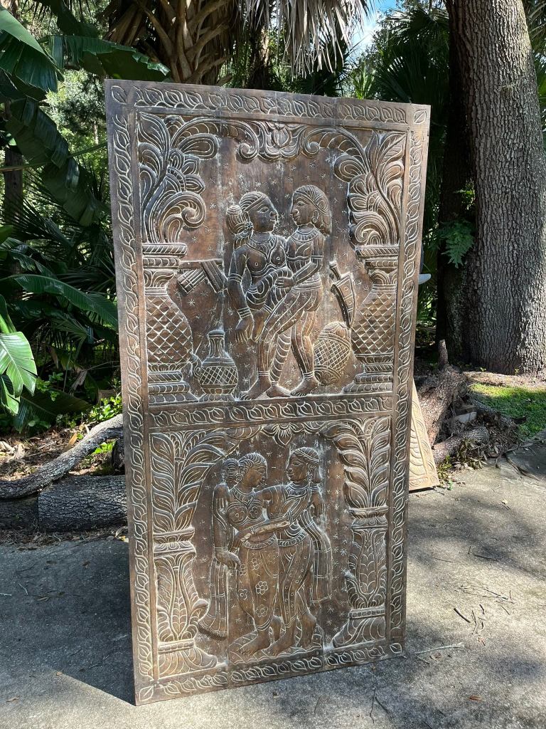 Resort-style themed decor with carved barn doors offers a luxurious yet grounded ambiance. Featuring the Antiqued Fluting Krishna with Cow, a vintage Indian carving wall sculpture of the hand-carved Krishna make a perfect addition to any room, yoga studio, or vintage interior decor. Whether used as a sliding barn door, an artistic statement piece, or…