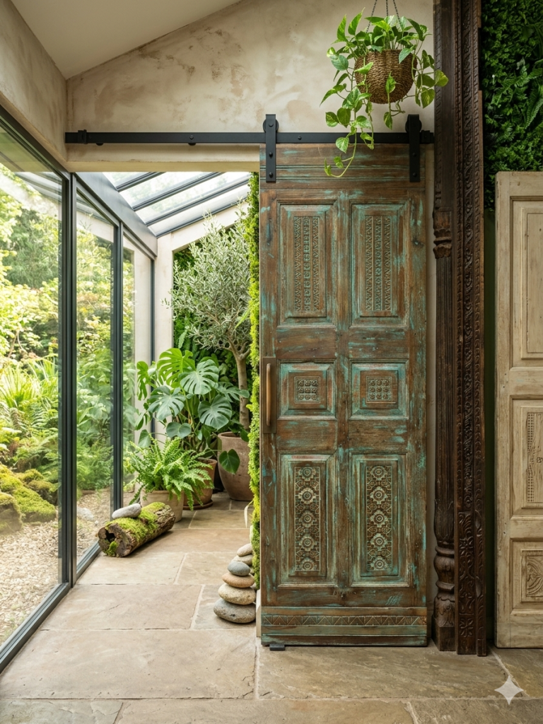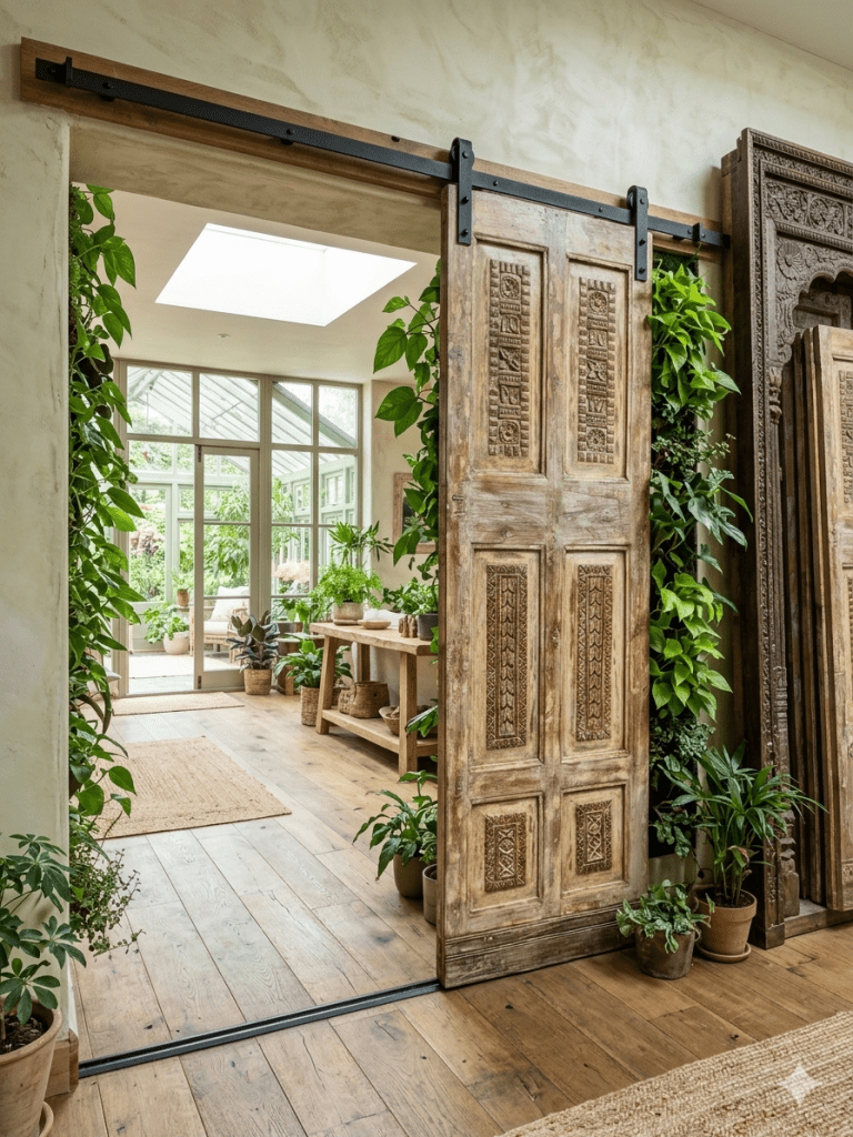 Rustic Farmhouse Décor with Vintage Doors and Earthy Wood Elements