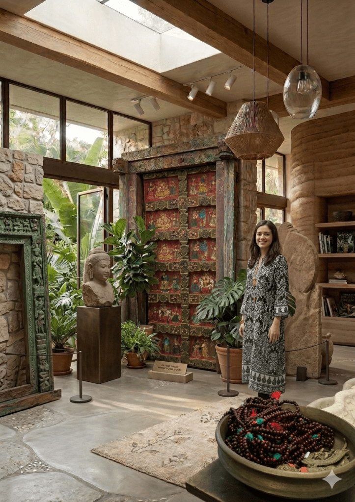 Surrounding the panels, the design leans into an eclectic mix of global influences. Low vintage coffee tables, antique sideboards, and worn leather seating invite guests to relax rather than simply pass through. Jewel-toned fabrics—deep emerald, indigo, and burnt saffron—add richness without overpowering the room’s historic character. Every surface feels collected, as though each piece arrived from a different journey and somehow found its perfect place here.