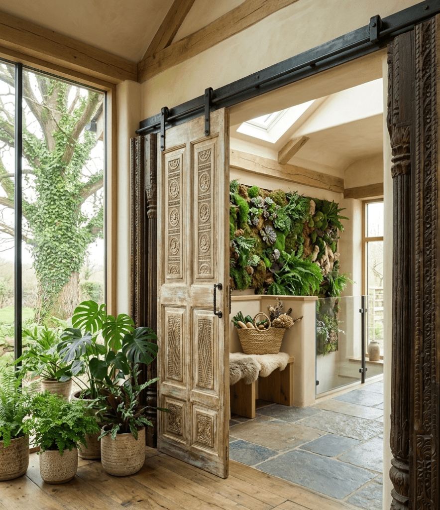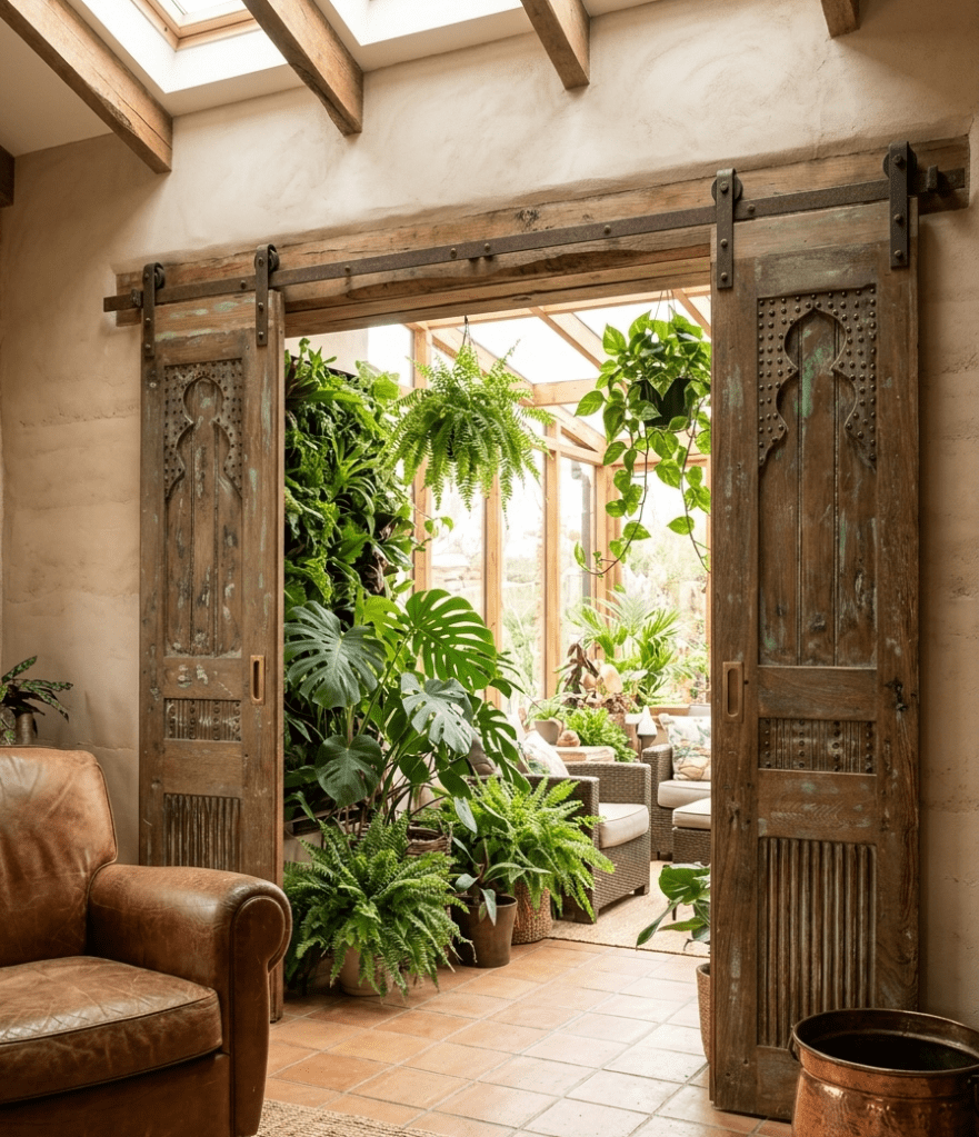 - Rustic Farmhouse Décor with Vintage Doors and Earthy Wood Elements