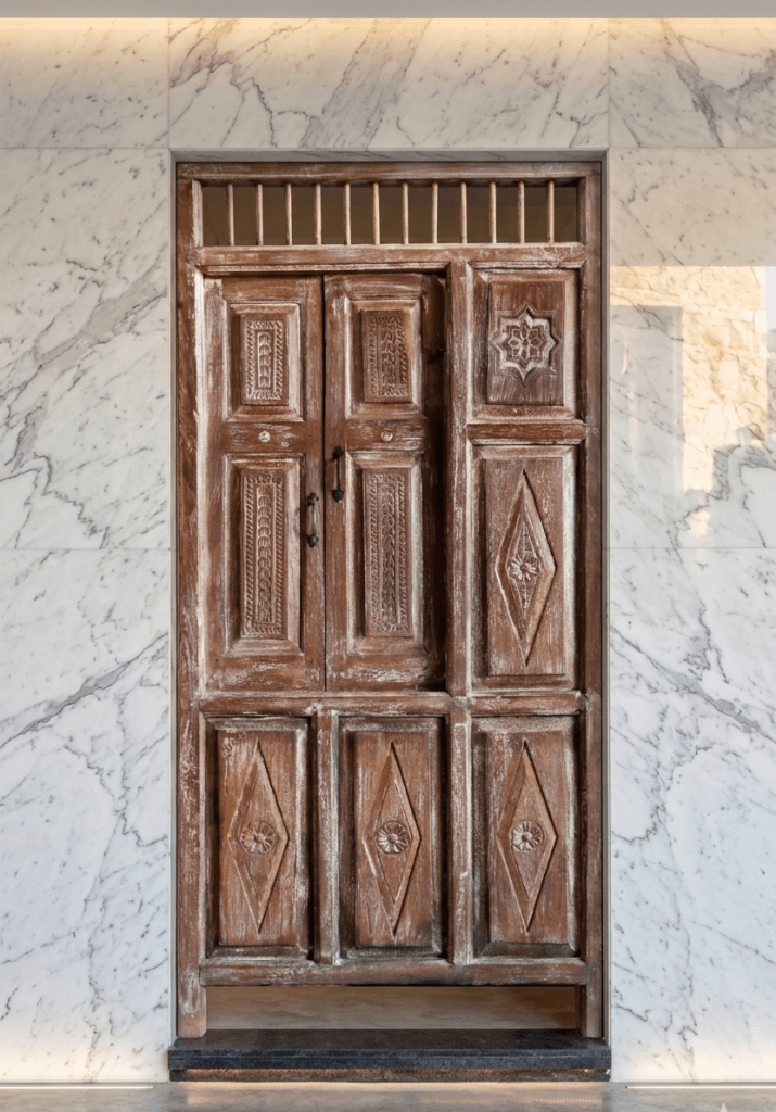 “A door carved from nature does not merely open a room — it opens the nervous system,” says the design team at Mogul Interior. “The eye softens, the breath slows, and the home begins its work.” That intention is visible in every detail: the depth of each relief, the deliberate irregularity of hand-tooled edges, the way organic motifs wrap around the frame as though growing there.