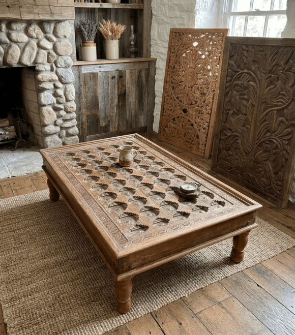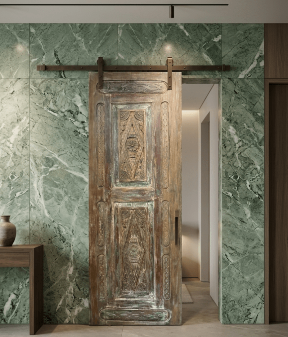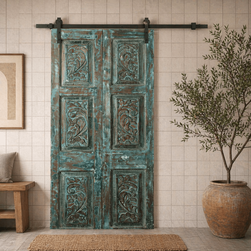 Decorative elements are where the personality of the room truly shines, and mixing pieces from different cultures and time periods brings in an eclectic, collected look. Antique Indian doors can serve as unique wall art, creating a dramatic impact with their intricate carvings and aged patina, which add an element of craftsmanship and history.