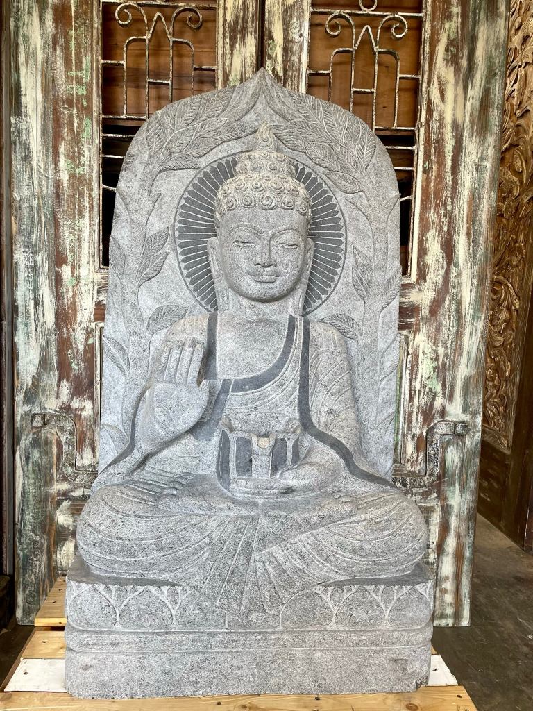Combine the new into the old. The bathroom glass shower disappears into the stone wall. The carved Tree of Life barn door adds softness to this rustic room. Exposed beams and a carved natural stone Buddha statue carries the zen ambiance through with a waterfall cascading behind it and lots of broad leaf palms accent the white stone walls. Exposed plumbing and electrical conduits run parallel to the cabinets. Primitive lanterns and old ceiling fans with a utilitarian feel hang from the exposed rafters. Rustic handmade wardrobe cabinets give extra storage as well giving and old world sophistication to the room.