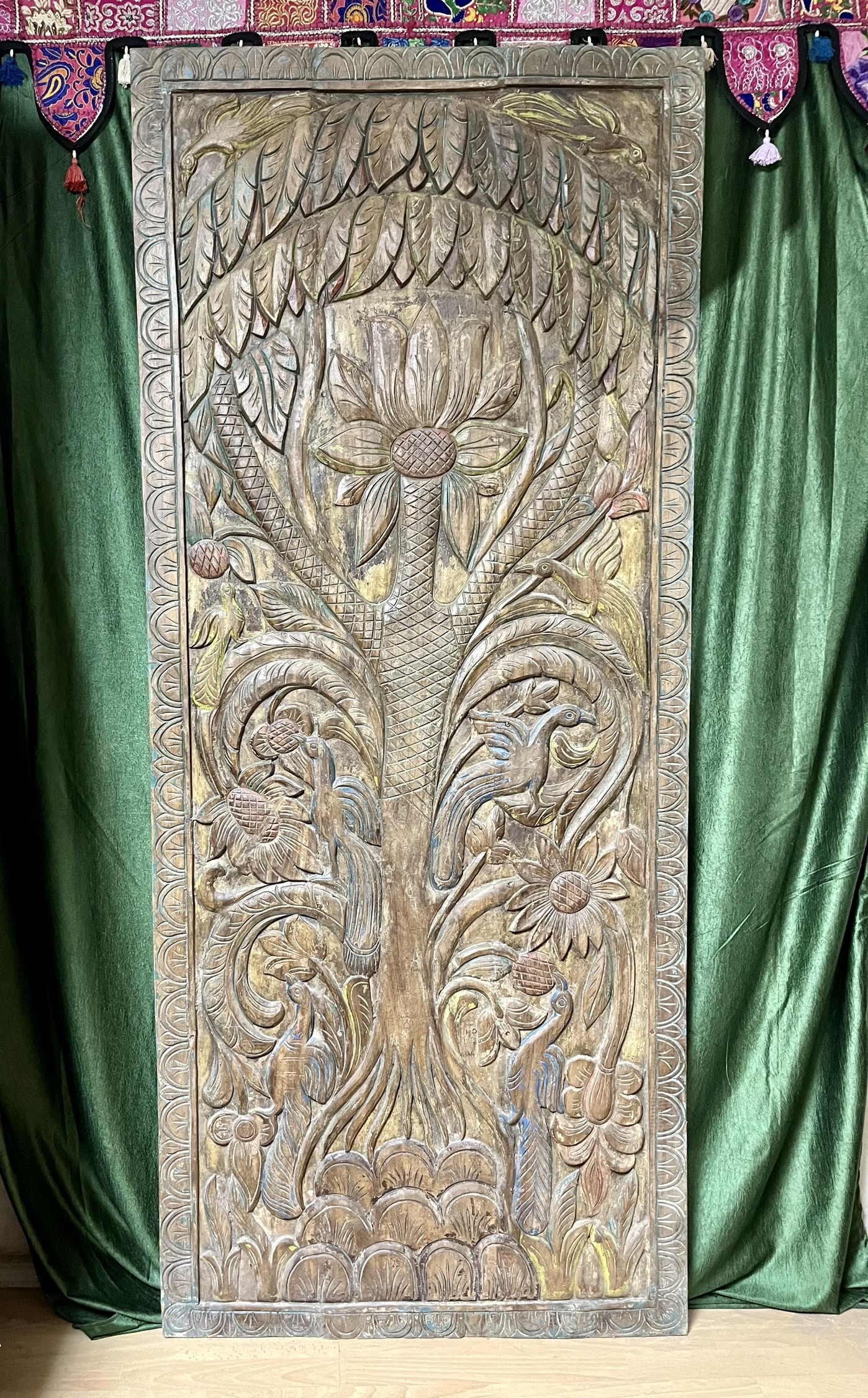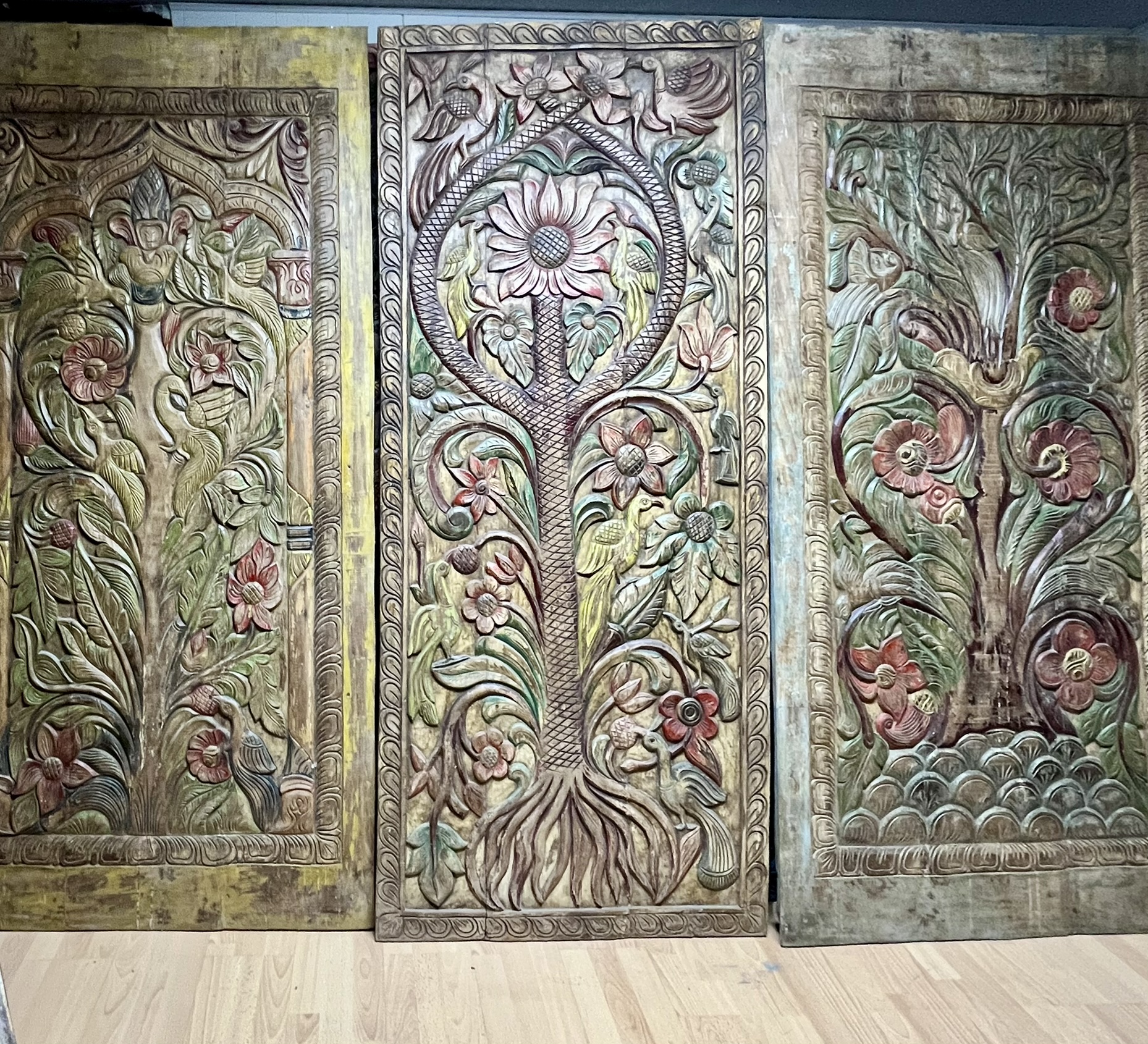 Mogul Interior presents unique holistic carved rustic carved doors, Wall Sculptures and door panels with beautiful floral motifs, Tree of life carvings. Vintage Indian carvings of Krishna, Ganesha, Buddha, Shiva, Durga, tribal birds and animals, carvings inspired from ancient cultures bring in a sense of wellbeing. Tribal carved wood panels are perfect for rustic decor, Spanish and Mediterranean style homes. Carved barn doors with textured woods in warm patinas, the traditional styles deliver an artistic statement for rnch styled interiors and bring healing energies to your home sanctuary. Rustic reclaimed dense woods used in the eclectic barn doors are hand carved with medallions, florals and sunrays bringing in the elements of nature and are so beautifully earthy as well. Shop At Etsy DoorsByMJ