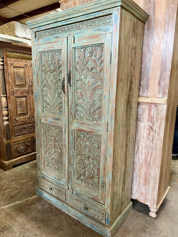 The carved armoires with intricate floral motifs bring a touch of nature into your home, their soft patinas in whites and grays exuding a sense of serenity and subtle sophistication. For a bold statement, the magnificent Haveli door wardrobe cabinet in striking hues of red stands out with confidence and clarity. Featuring brass medallions and carved corners, this unique piece is a true work of art, crafted using old-world techniques. With extra depth, it also serves as a stunning storage solution, perfect for housing a wine collection or treasured keepsakes.