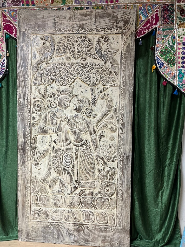 Colors have a profound impact on mood, and the washed greens and blues of vintage wood evoke a sense of calm and balance. The hand-carved barn doors in muted whites, with hints of color seeping through the weathered wood, make for a striking architectural statement. These one-of-a-kind doors, adorned with intricate depictions of Radha and Krishna, reflect mindful artistry and spiritual harmony.