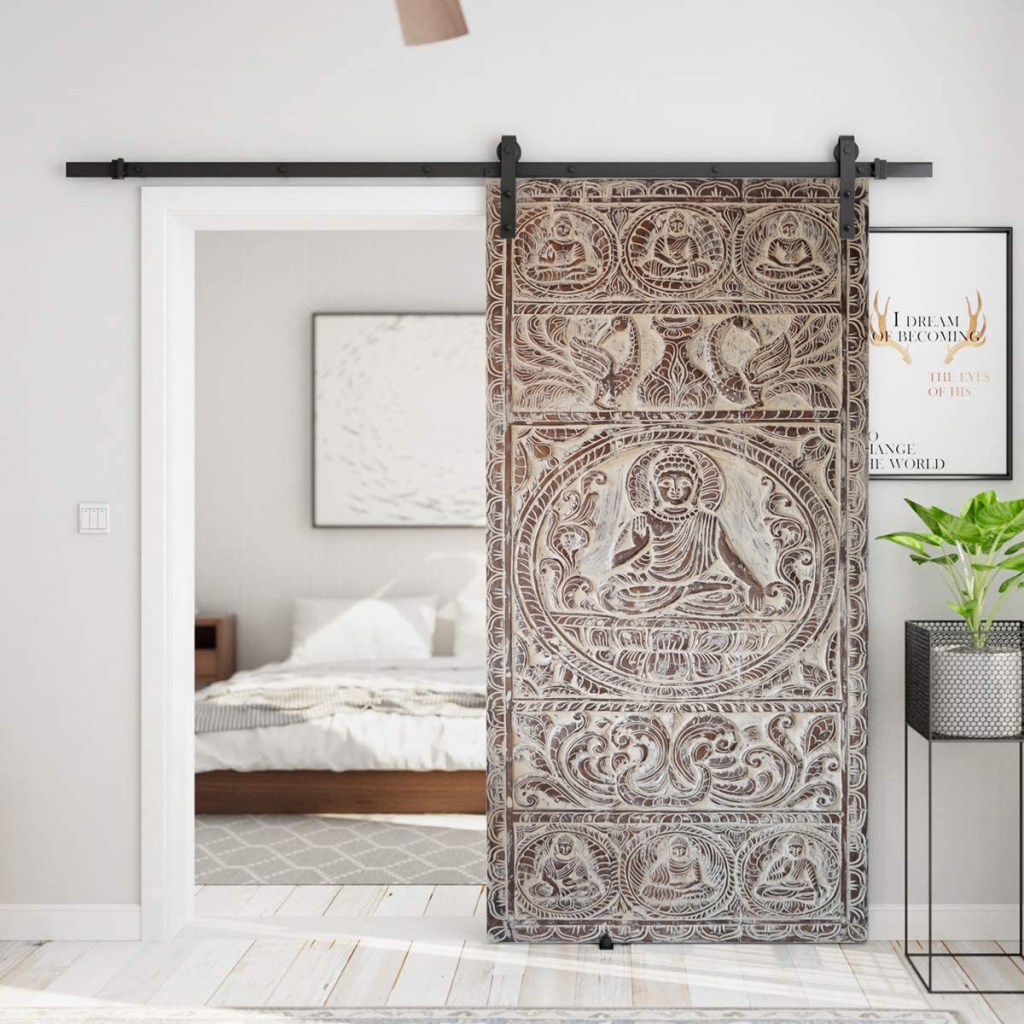 At the heart of this serene retreat is the Vintage Buddha Carved Door, its artistic carved detail with holistic design magnifies my energies. This colorful Buddha barn door opens to my yoga studio where i seek inner peace and wellness. It elevates my spirit with its serene beauty, inviting mindfulness and contemplation. Every time you pass through this door, you’re taken to the temples of Bali, a place of calm and reflection, where the hustle and bustle of everyday life fades away.