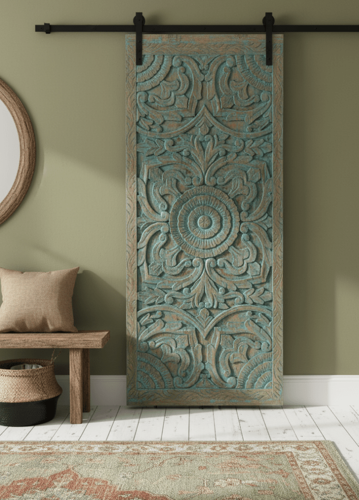 The symbols of chakra, lotus, sun and trees carry the healing energy of nature. The rustic worn patina of reclaimed wood in hues of blues, teals, beige and green make each door standout as an artistic design statement.Barn doors are very practical and functional for areas where there are tight corners, custom design sliding door are versatile such that they can be used as bedroom doorbathroom door, patio door, the vintage handcarved hanging doors make the interiors look spacious and add a unique charm to your decor.