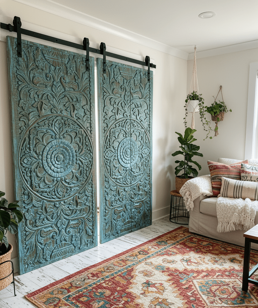 Eclectic carved barn doors are a huge design statement in luxury farmhouses, or modern interiors.The artistic carved panels are customized into sliding doors and interior bedroom doors, each is unique piece of art. The barn doors are made from reclaimed wood and carved with beautiful designs inspired from old Indian architecture. find Us at Etsy DoorsByMJ