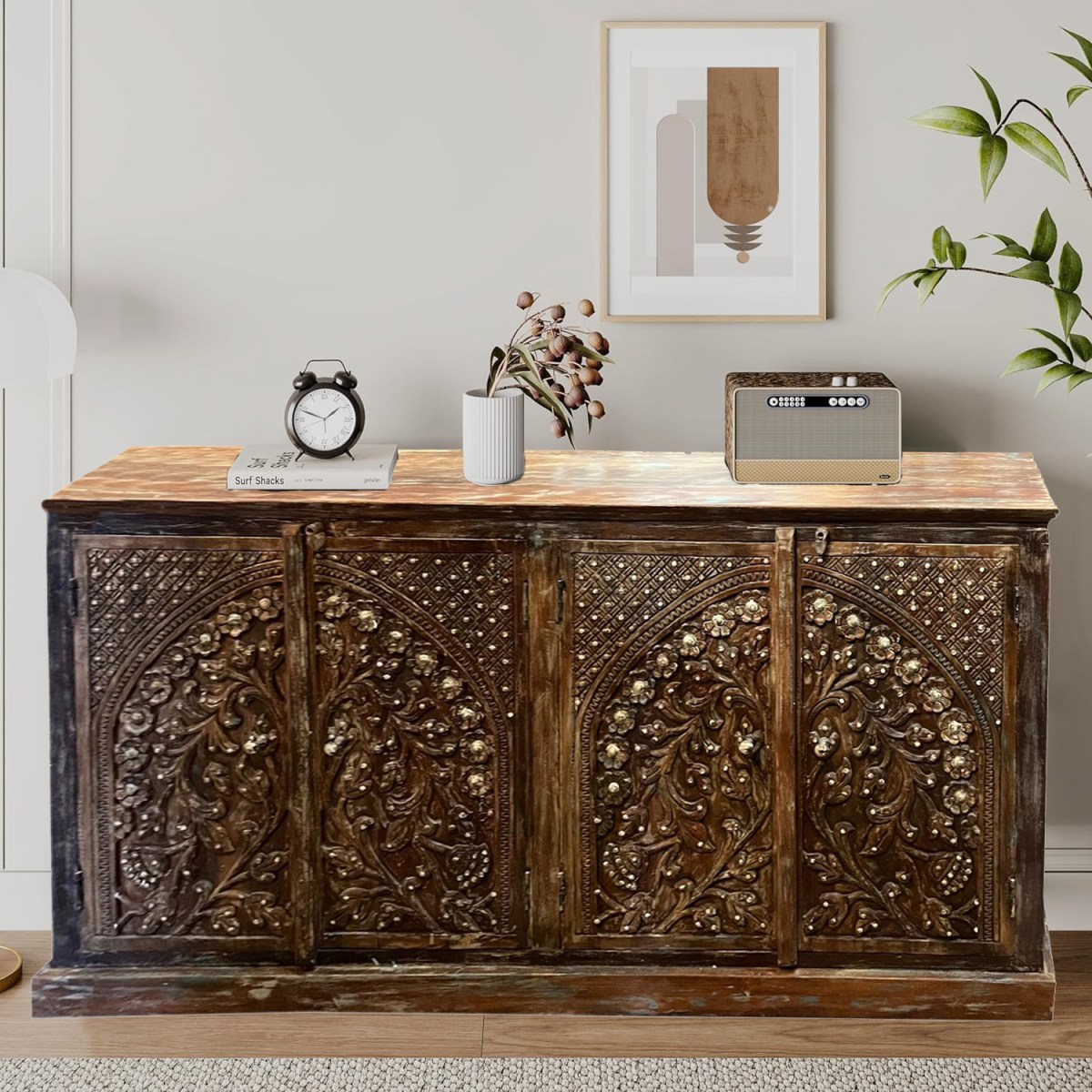 The eclectic mix of colors and textures, showcased in antique Indian doors and carved barn doors, revitalizes previously lackluster spaces. Embellished tapestries and sheer sari curtains intertwine various patterns and textures to make a bold bohemian statement. Distressed aged wood cabinets, adorned with metals, and old door sideboard media consoles exude a spirited energy that resonates throughout the home. Shop Carved Door At Etsy Mogulgallery