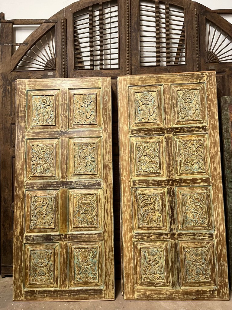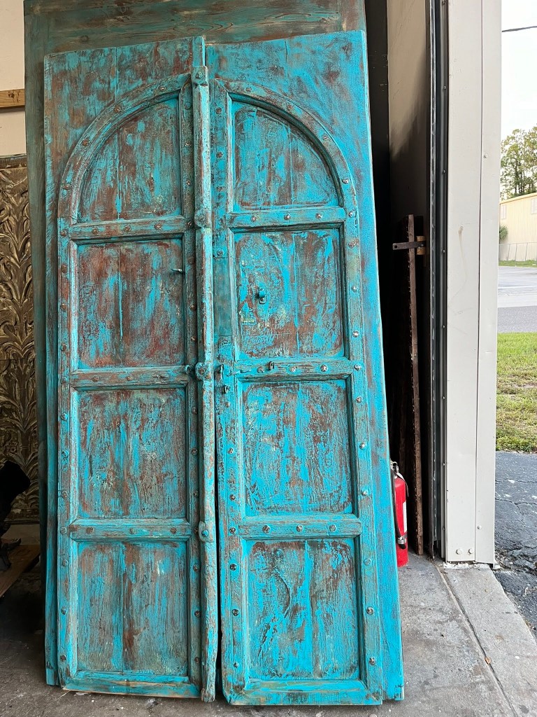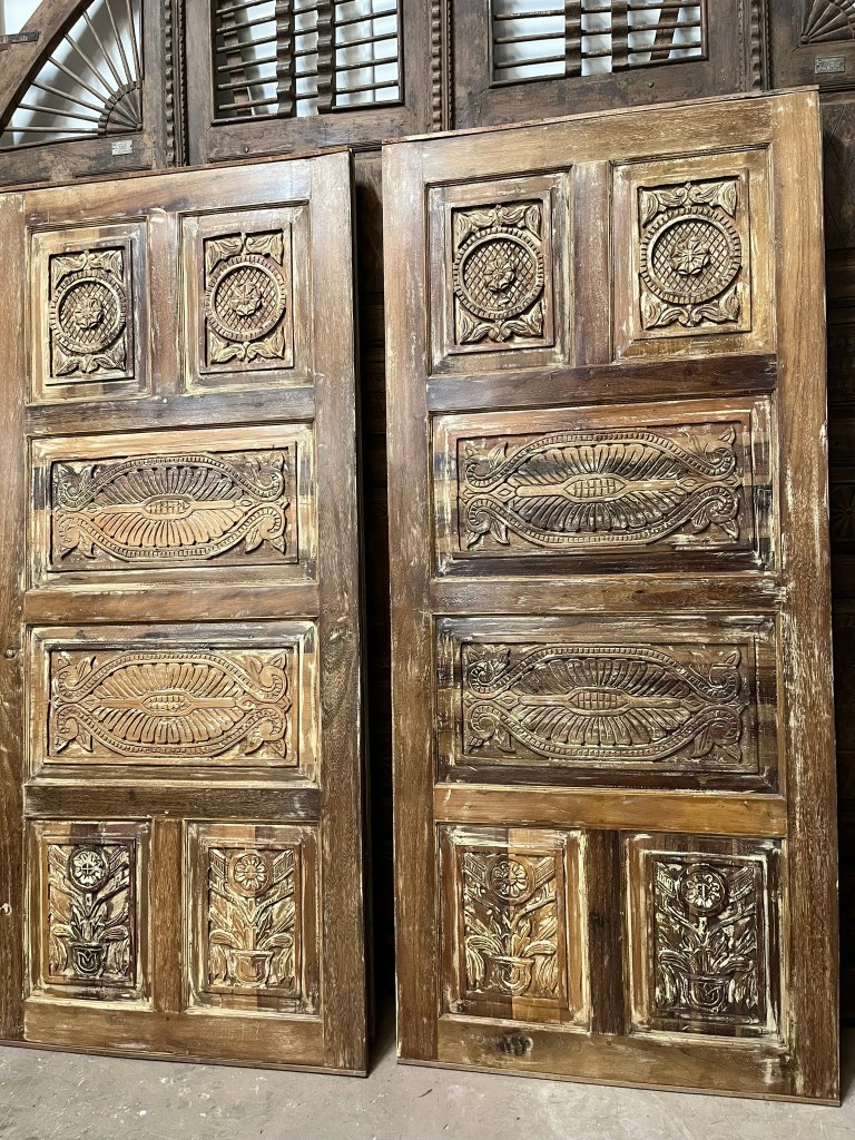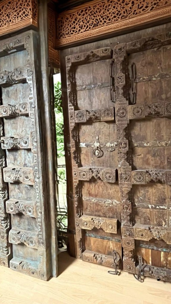 The inclusion of Haveli antique Indian doors and antique India fortress gates speaks to our love for statement pieces that tell a story. These rustic teak double doors, with their hand-carved designs and weathered patina, become focal points that anchor the space. The arched teak patio doors, which lead out to the garden, are a perfect example of how old-world charm can blend seamlessly with modern living.