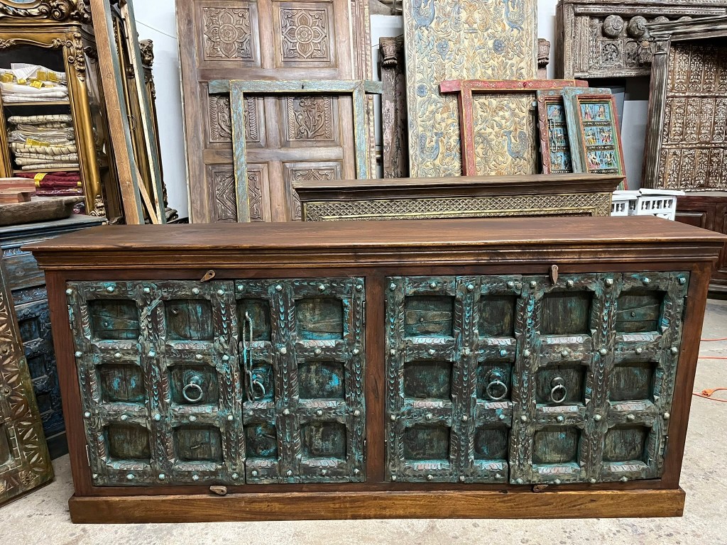 In the kitchen, we chose to mix rustic armoires and sideboards with the Spanish-styled architecture. The soft ivory walls provide a neutral backdrop that allows these furniture pieces to stand out, while their aged, distressed look complements the overall feel of the space. The combination of antique Indian furnishings with Spanish architecture creates a beautiful fusion of global influences that is both unique and deeply personal.