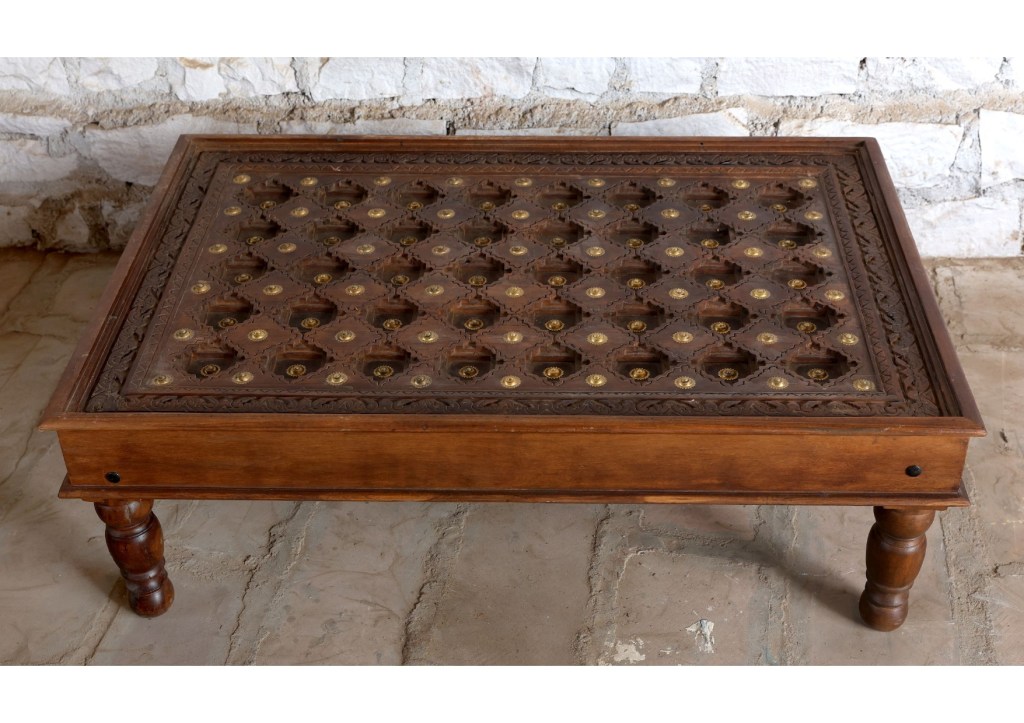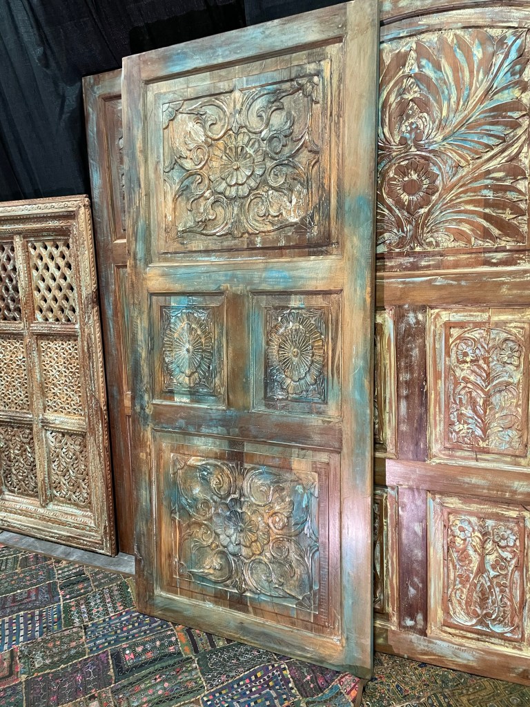 The exterior features rough-hewn timber walls, weathered by years of sun, rain, and wind, yet radiating a warm, inviting aura. The richly textured antique doors add character and authenticity to the cottage’s appearance, each one telling stories of ancient cultures. Two meticulously crafted vintage barn doors, adorned with intricate patterns and motifs, serve as statement entrances to the master bedroom. Each carving showcases the artisan’s skill, reflecting the essence of rural life, hard work, and simple pleasures.