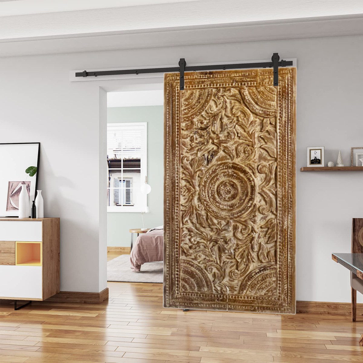 Bring a touch of nature to any space with this hand-carved, salvaged wood barn door. Every unique panel is artfully designed with florals and twines for a wild yet earthy aesthetic. An ideal solution for sliding doors, closets, or room dividers, this door panel brings in a creative and modern atmosphere.