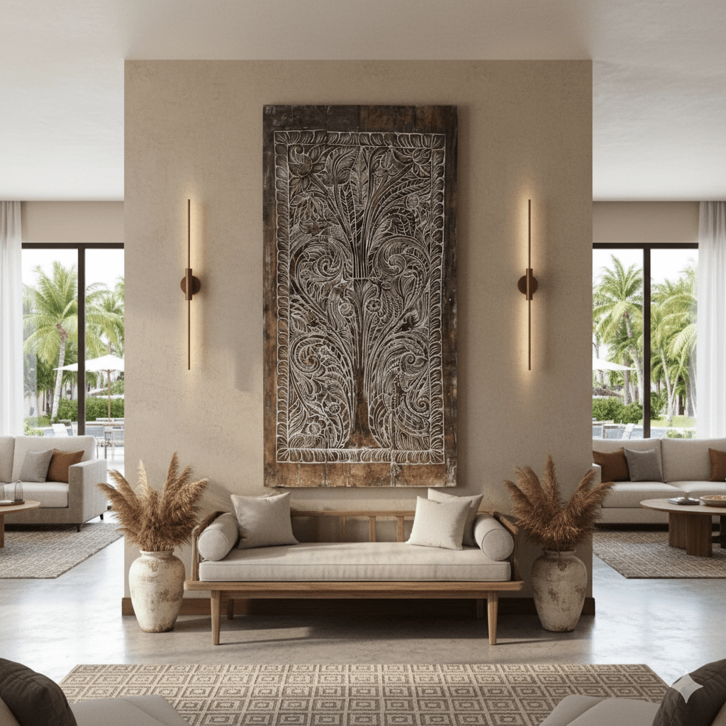 Bring the outdoors in with lush greenery and potted plants. Consider hanging tree of life wall carvings to add vibrancy and life to the room. The juxtaposition of organic elements against the aged patina of the doors can create a visually striking contrast.