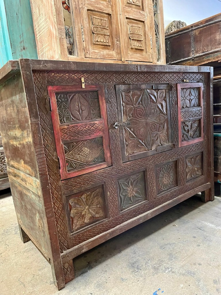 Look for hand-carved floral motifs, geometric patterns, or antique doors repurposed into unique furniture pieces. A dark-stained, distressed, or whitewashed finish enhances the vintage appeal. Storage functionality is essential, with cabinets, shelves, and drawers providing organization for dining essentials, barware, or entertainment accessories.