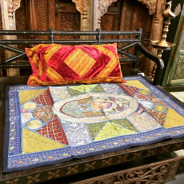 Exotic color and texture play with sumptuously hand printed bedcovers in rich luxurious detail. Sari curtains glamorize the windows, and the antique banjara tapestry gives a classic vibe to the bedroom.