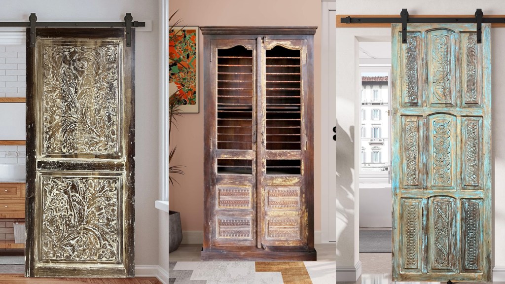 Vintage rustic carved wood elements create a harmonious balance between modern gadgetry and sophisticated appliances, grounding your home with earthing antique doors and rich patinas. Whether used as headboards, office doors, or statement entryways, these hand-carved doors—adorned with ancient symbols of good luck and protection—tell timeless stories of the past through their weathered finishes and studded metals. The key to a healing home lies in embracing rustic elegance and a connection to Mother Earth.