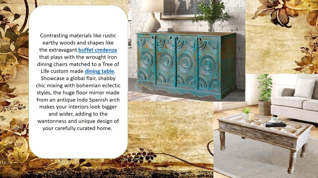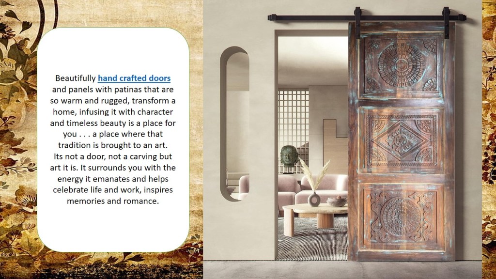 Create a home fitting for its surroundings with Mogul Interior Harmony collection of carved doors, in a forest in Blue Mountains In a new-built annex, a raised daybed-cum-window seat sits next to a wall of glazing. The organic modern interior features details such as vintage  textile fabrics and antique wood furniture, while the colour palette was kept earthy and calming. The interior of the resort hotel has a pared-down feel to it, but its well-sourced accessories add interest. From the old door credenzas & the rustic carved consoles each piece has been thoughtfully accessorized. Curving and arched walls give the New York apartment an unusual look. While the architecture is eye-catching, its colour and material palette was kept natural and subtle.