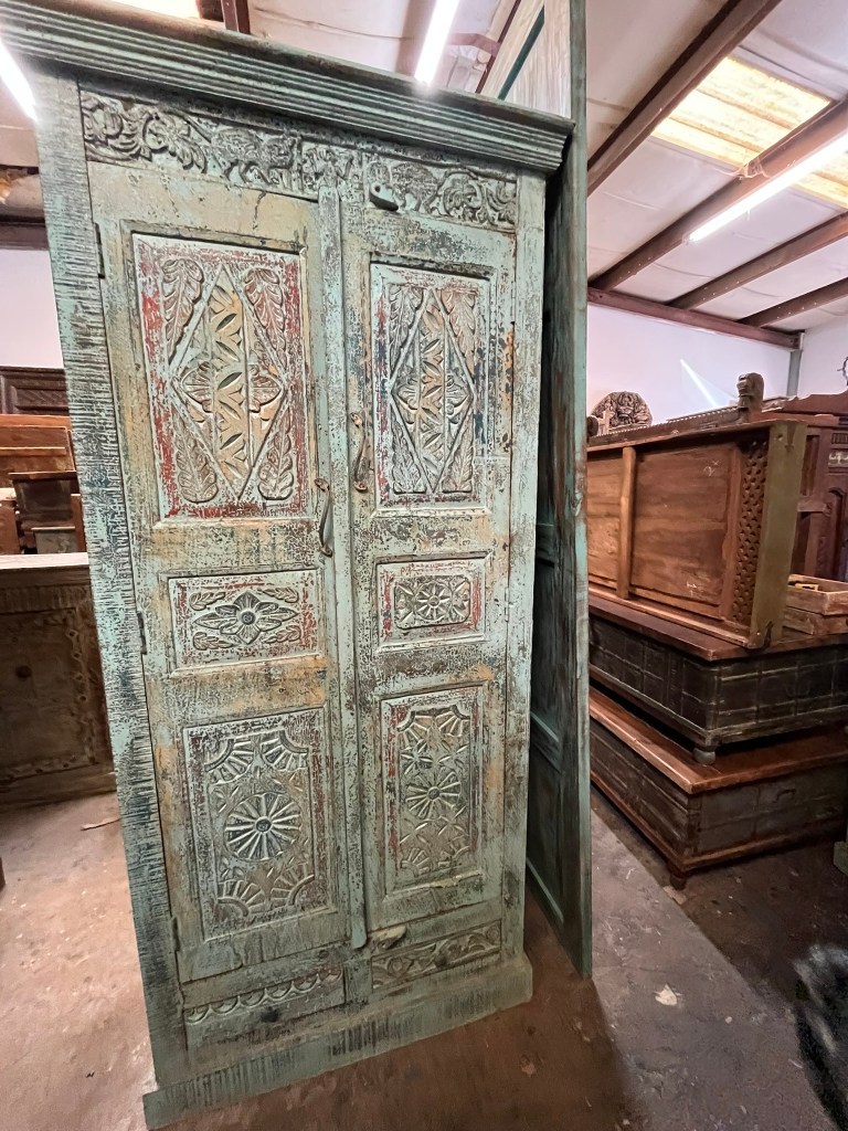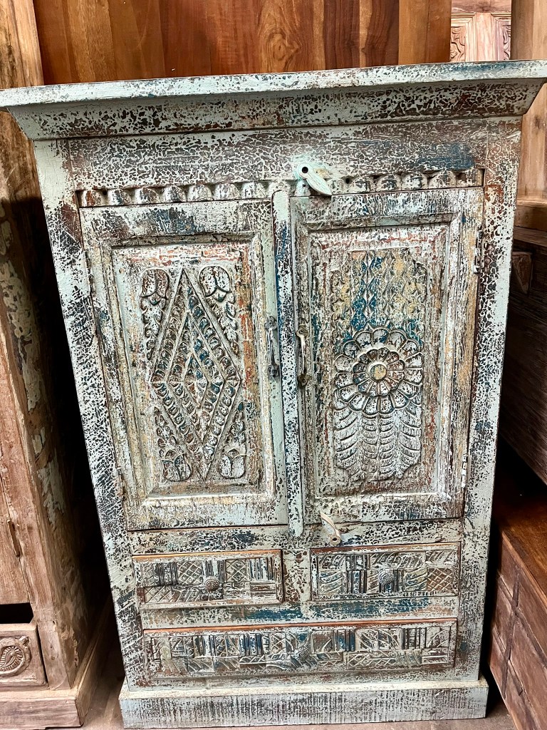 Distressed wood cabinets, studded with metal details, along with vintage door-sideboard consoles, add a rustic, free-spirited vibe to the room. For those who love color, bohemian décor thrives on vibrant hues—think turquoise coffee tables, ochre yellow cabinets, and Indian carved barn doors featuring deities like Krishna and Ganesha. These pieces connect your home to ancient traditions and sacred energies, enhancing its vibrancy and spiritual warmth.