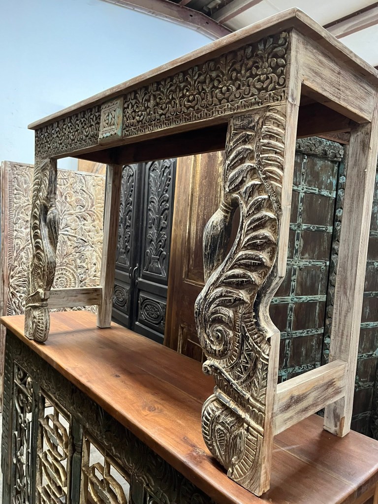 Brutalist architecture is often associated with an austere elegance, and this project embodies that concept to perfection. However, it is softened by the warm Mediterranean atmosphere, which adds a welcoming touch to the otherwise stark aesthetic. Natural elements such as carved wood doors introduce a hint of eclecticism, while a rustic credenza made from repurposed antique doors enhances the space with a sense of history and character.